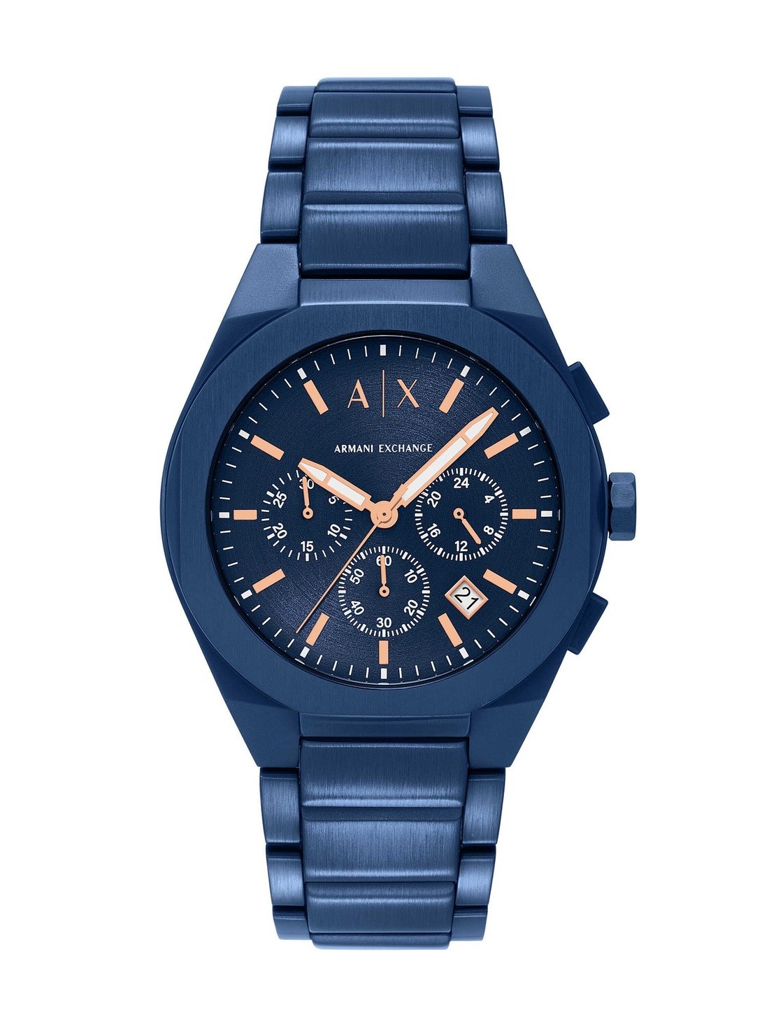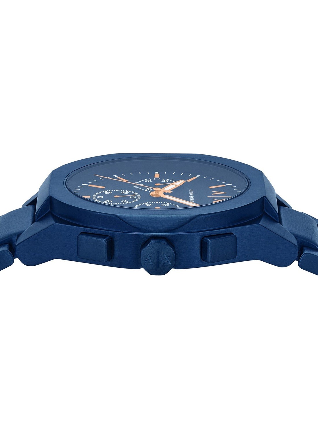 Short Description A brushed blue dial and matching stainless steel bracelet create a monochrome statement in this bold 42 mm chronograph. The case is crafted from blue stainless steel for a seamless finish, and the sub-dials add a functional edge. Sleek and streamlined, this piece embodies the modern street-inspired aesthetic Armani Exchange is known for.
