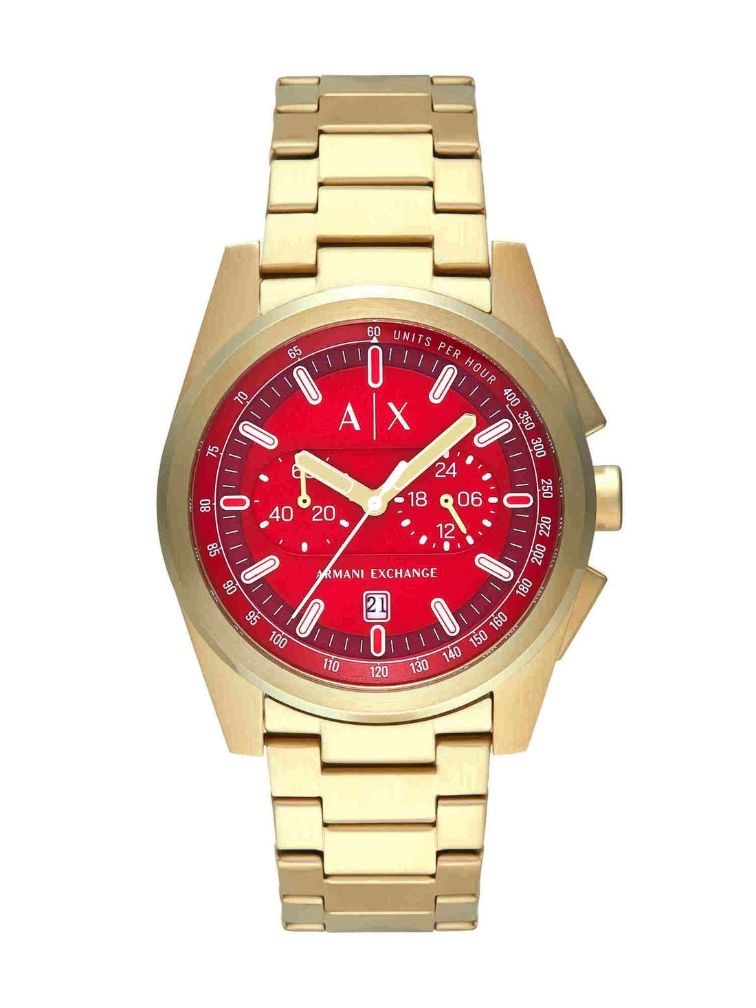 Short Description Armani Exchange's 42mm chronograph watch features a striking red matte dial that captures attention. The gold-tone stainless steel bracelet adds a touch of luxury, while the durable mineral crystal protects the dial. Powered by precise quartz chronograph movement, this watch combines style and functionality, making it a standout accessory for any occasion.