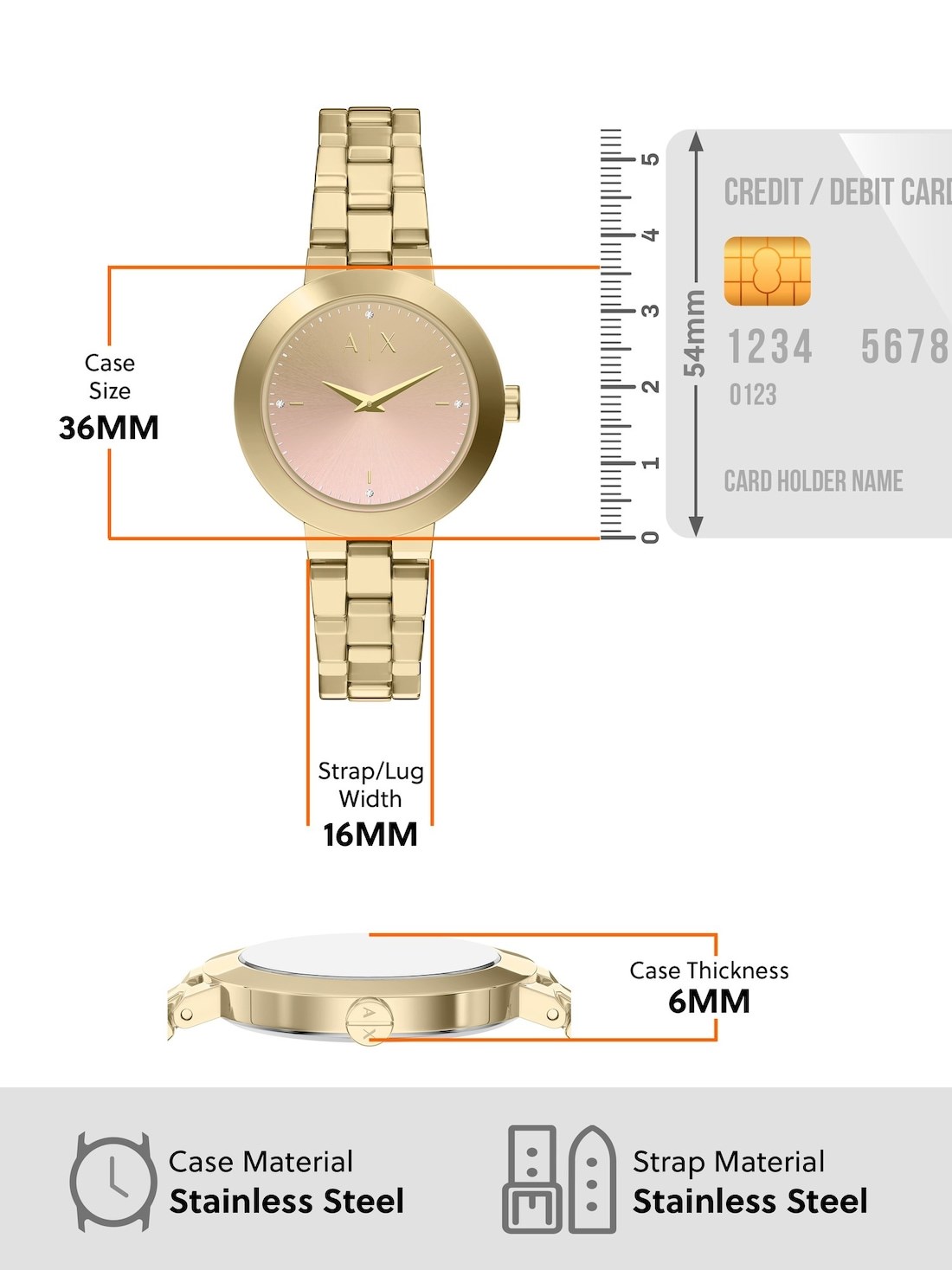 Watch Band: Gold durable stainless steel bracelet; links can be removed for a customized fit.