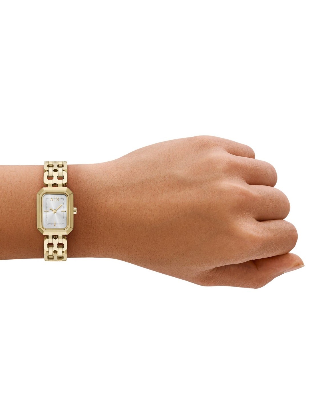 Short Description Armani Exchange's 27mm two-hand watch features a sleek rectangular case and a sophisticated sunray silver dial. The gold-tone stainless steel bracelet adds a touch of elegance, making it perfect for any occasion. Powered by precise quartz movement and protected by a mineral crystal, this watch combines style and functionality effortlessly.