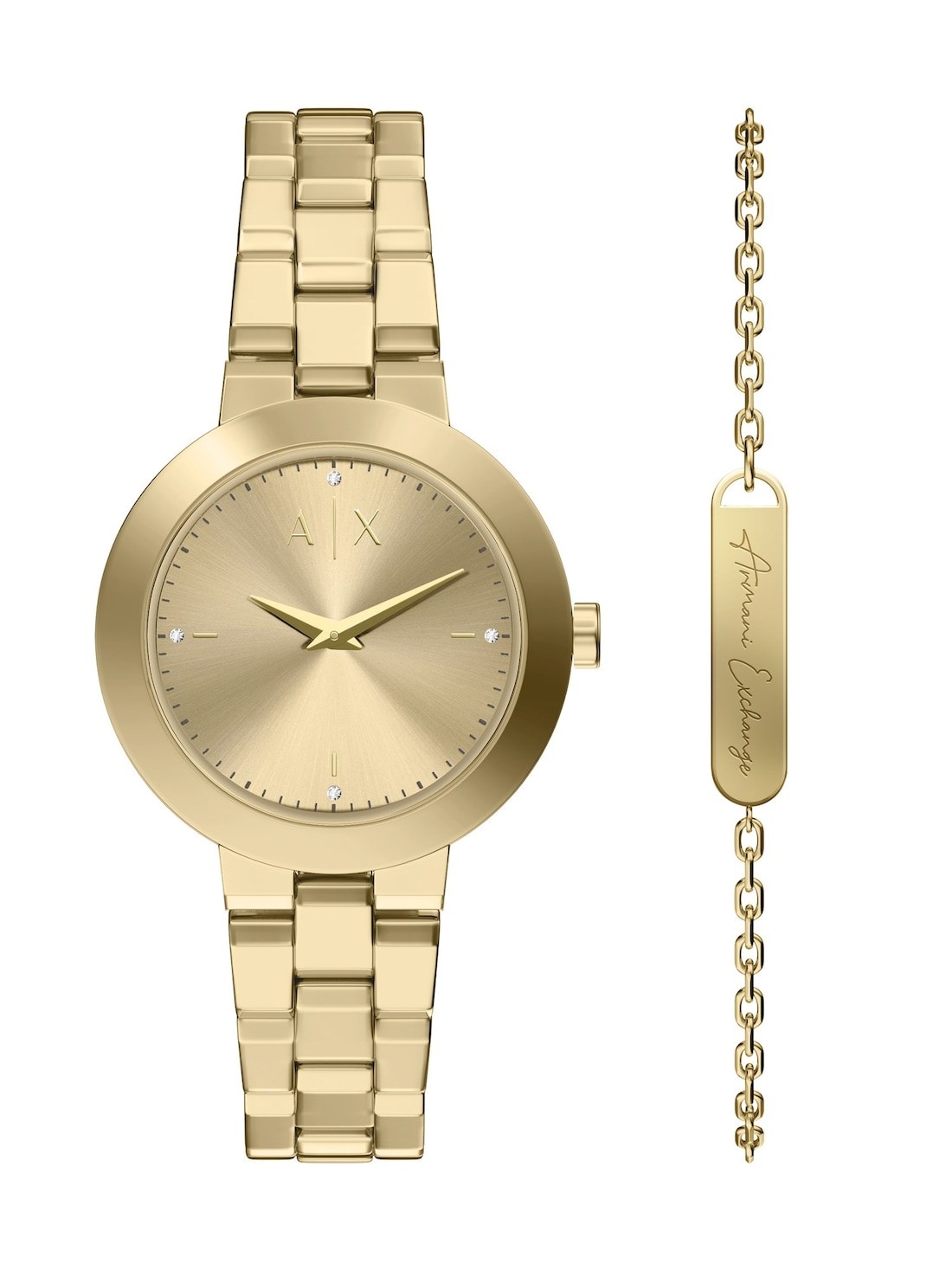 Watch Features armani exchange, armani exchange watch for women, women's armani exchange watch, stainless steel watches for women, gold watches for women, gold tone watches for women, japan, japanese movement, gift, set, gift set
