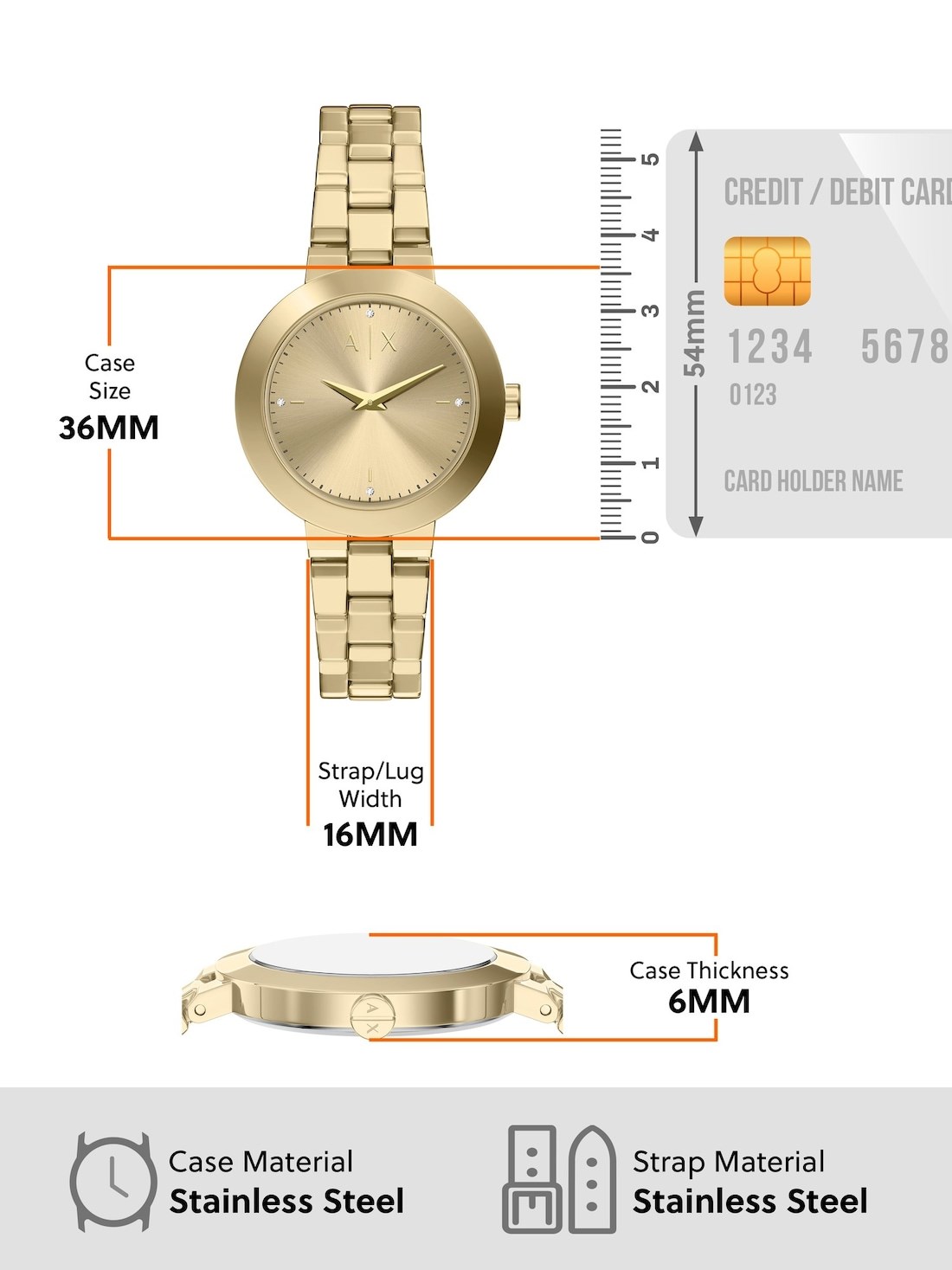 Watch Band: Gold durable stainless steel bracelet; links can be removed for a customized fit.