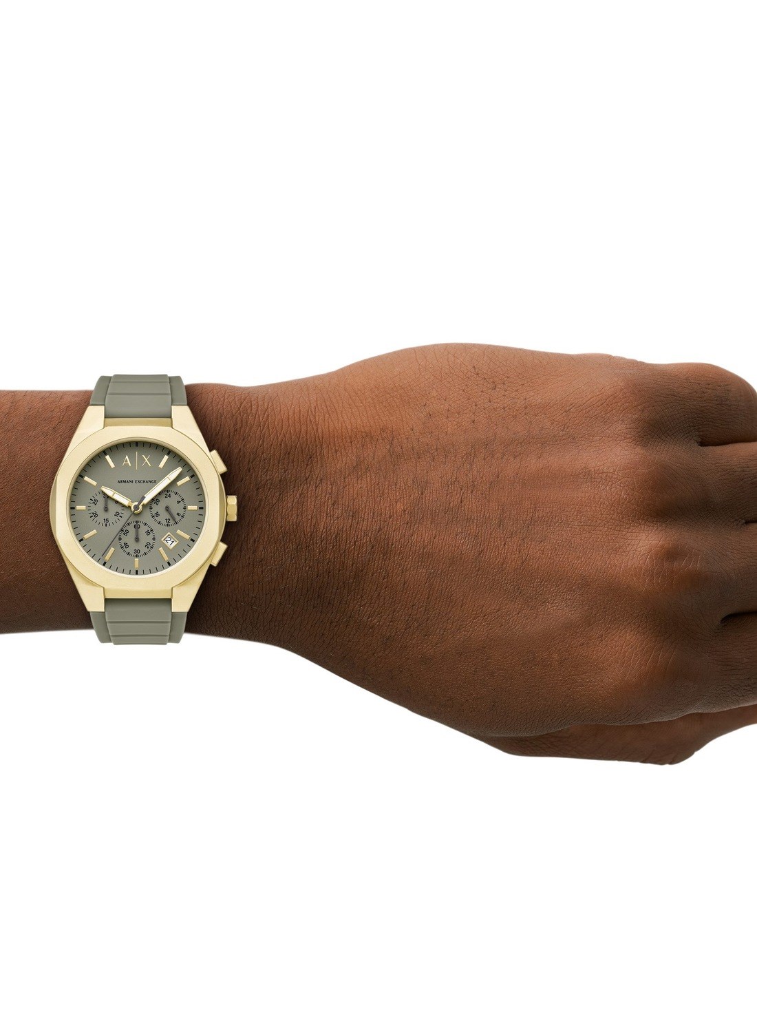 Short Description Armani Exchange Sync 42mm watch. A gold-tone stainless steel case contrasts effortlessly with a matte green dial and matching silicone strap for a modern, monochromatic look. Chronograph sub-dials add precise functionality, and a single prong strap buckle ensures a secure fit. This design blends bold color with clean, streamlined details for a statement-making presence.