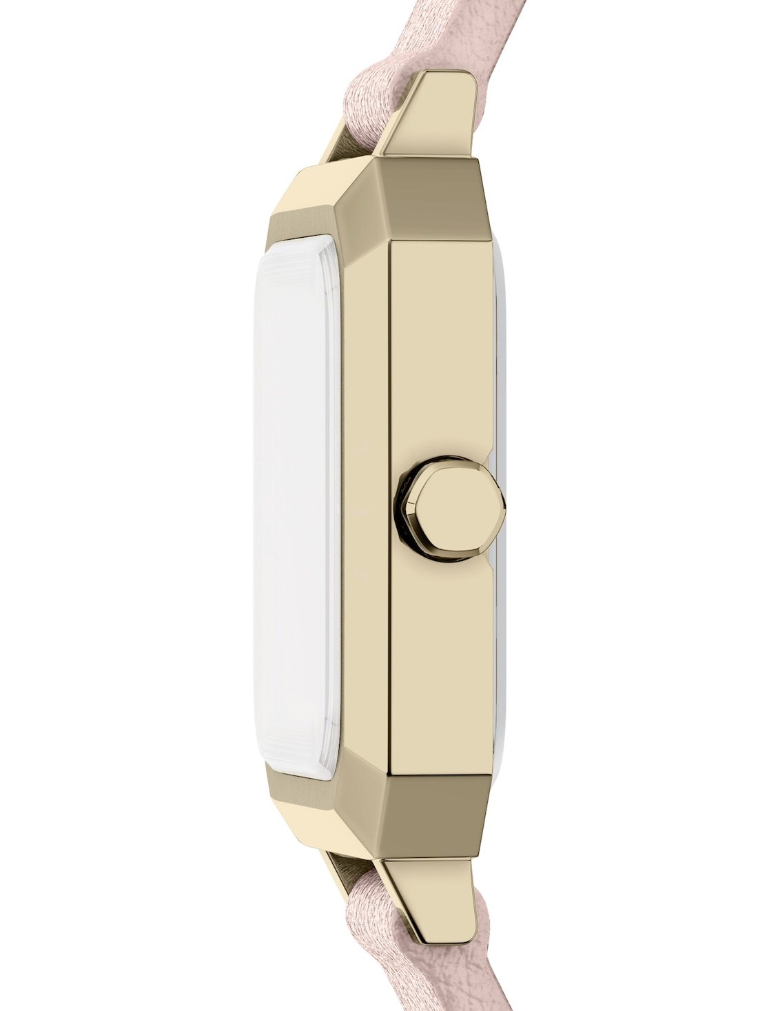 Short Description A gold-tone rectangular case frames a pink sunray dial, creating a monochromatic look with a warm, polished edge. The soft pink leather strap adds a tactile contrast and secures with a single prong buckle. Clean three-hand functionality keeps the design minimal and modern, perfect for everyday refinement.