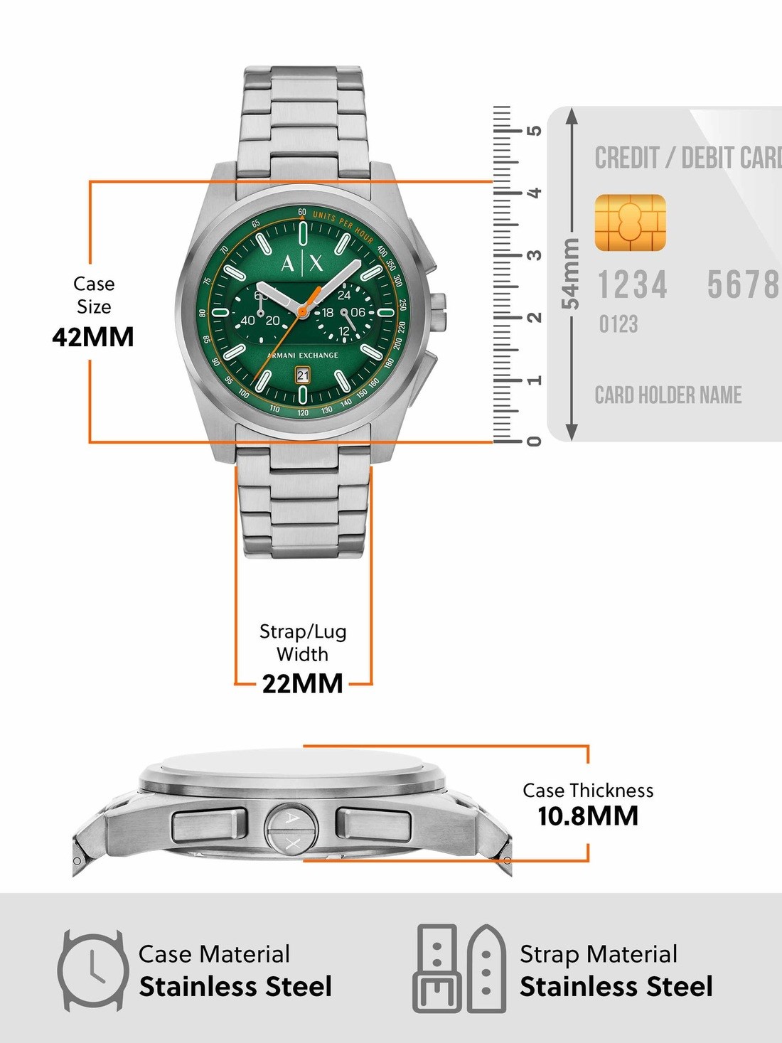 Short Description Armani Exchange's 42mm stainless steel watch features a striking green matte dial, chronograph movement, and a sleek stainless steel bracelet.