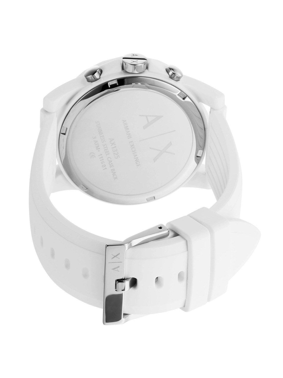 Short Description Bring your athletic style up a notch with this sleek Armani Exchange chronograph watch. The bold 44mm round white silicone case is a statement piece, while the white dial keeps it sporty and versatile. Water-resistant to 30 meters. Quartz movement with chronograph functionality. Yes, it's time to elevate your athleisure game.