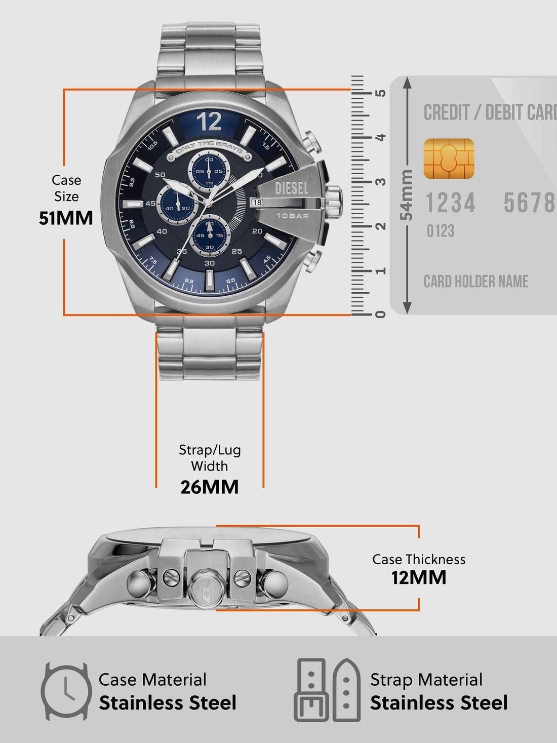 Short Description This stainless-steel Diesel Mega Chief watch features a matte blue chronograph dial with an “Only the Brave” tag and is complete with a single-link bracelet.