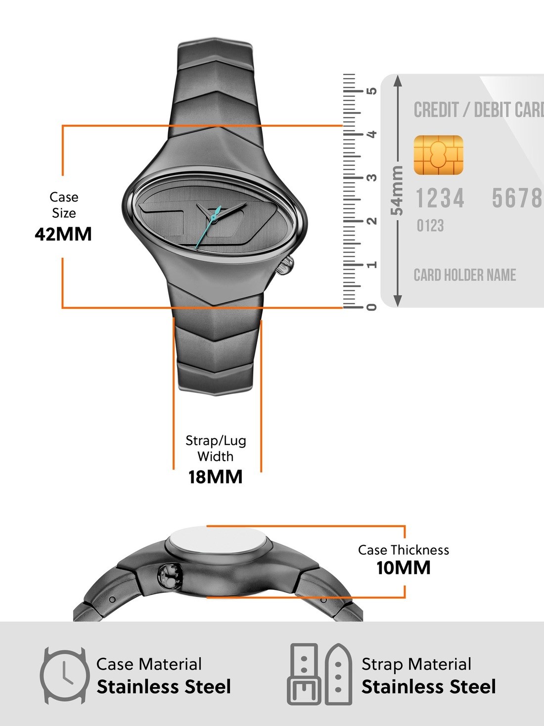 Short Description Diesel's 42mm D-Rush watch features a gray brushed dial, three-hand movement and a matte gunmetal stainless steel bracelet.