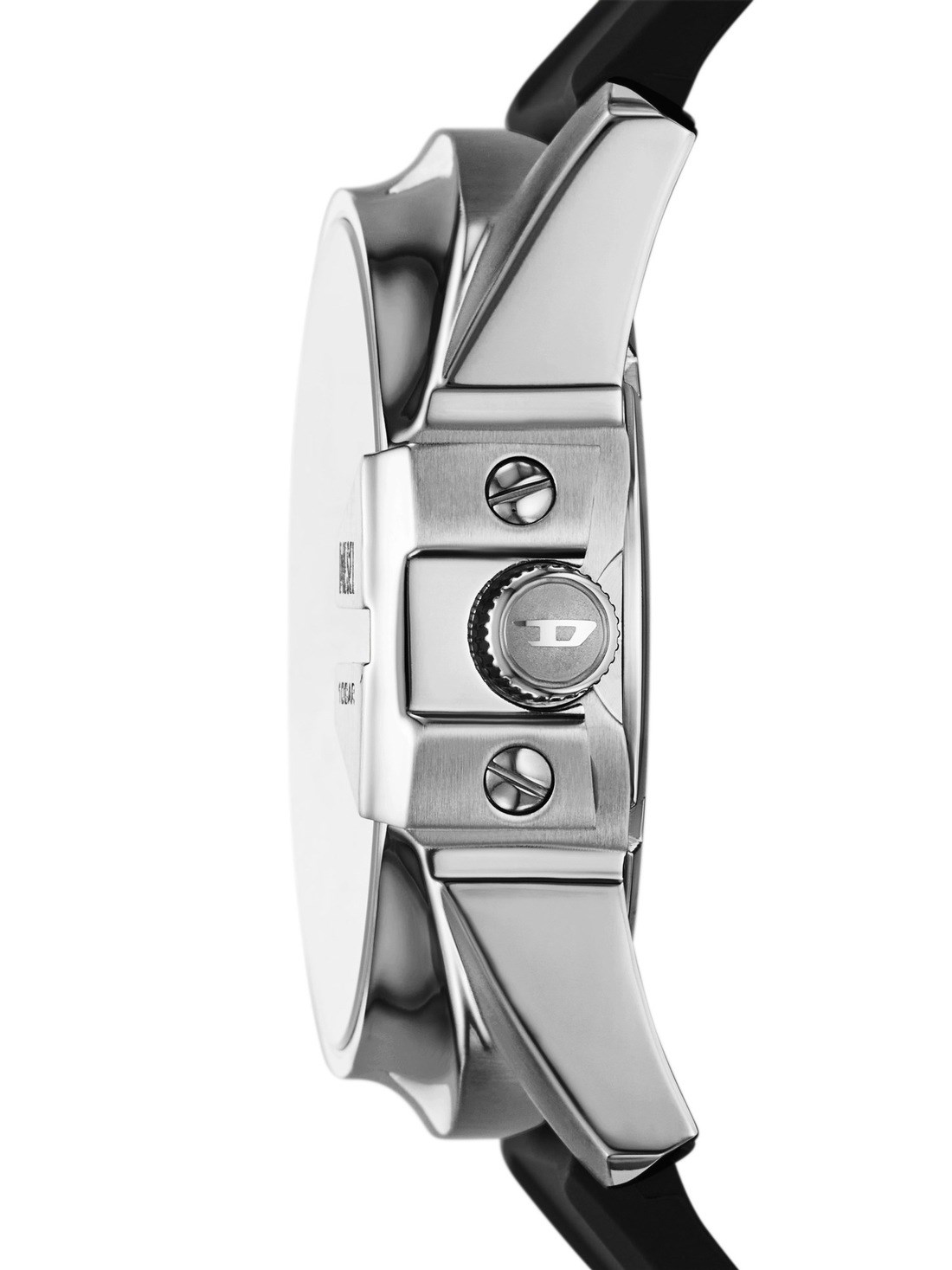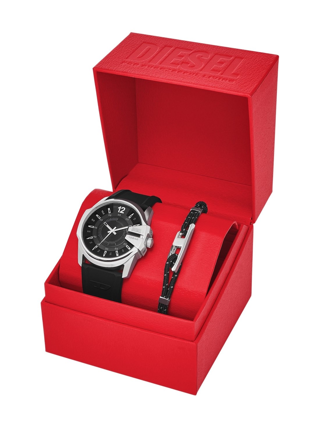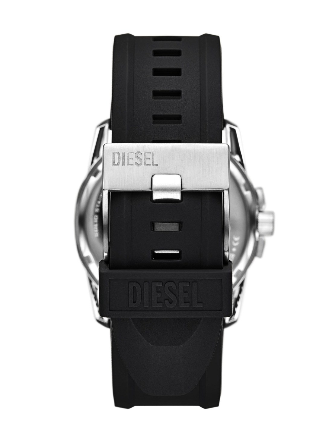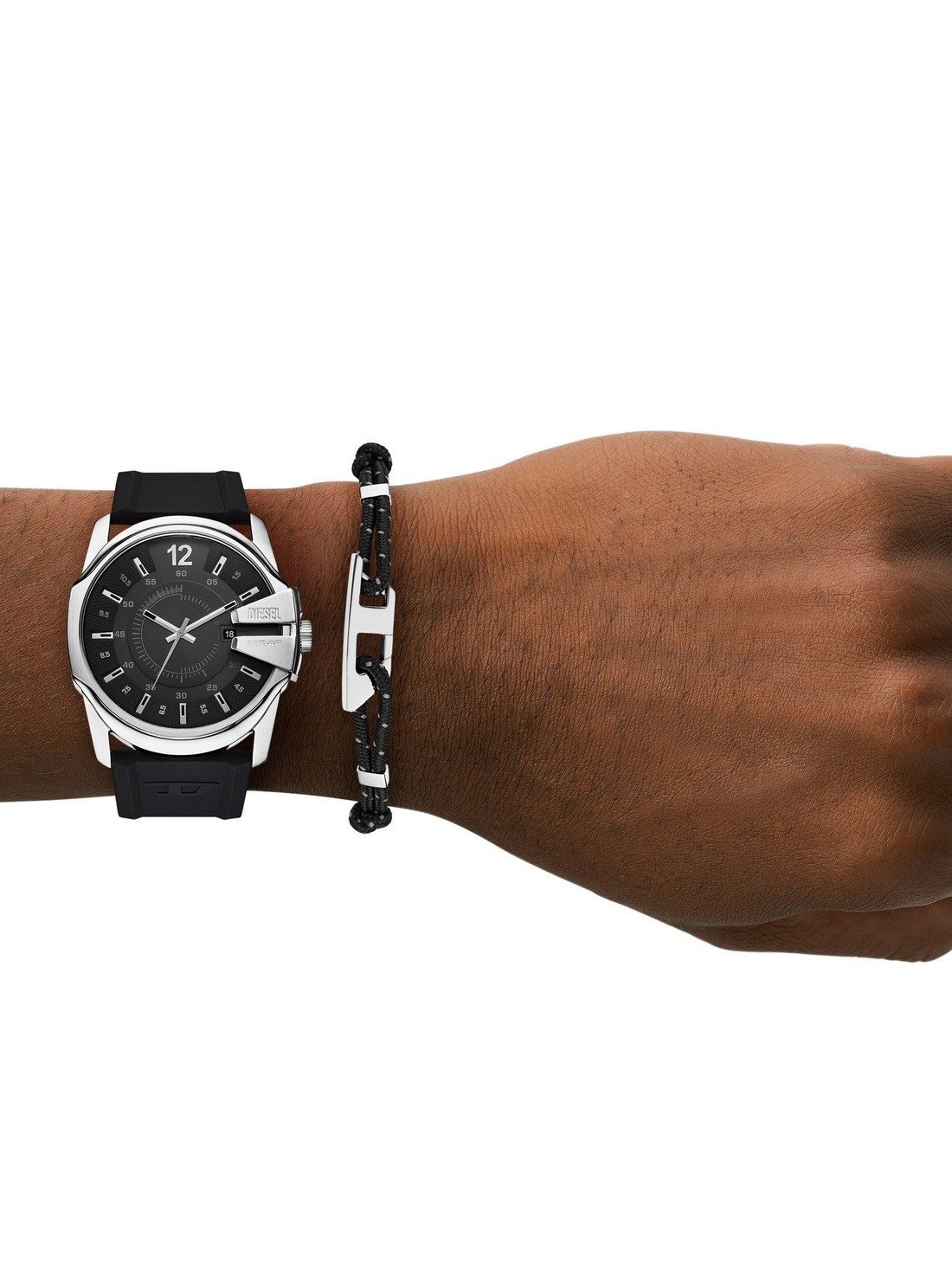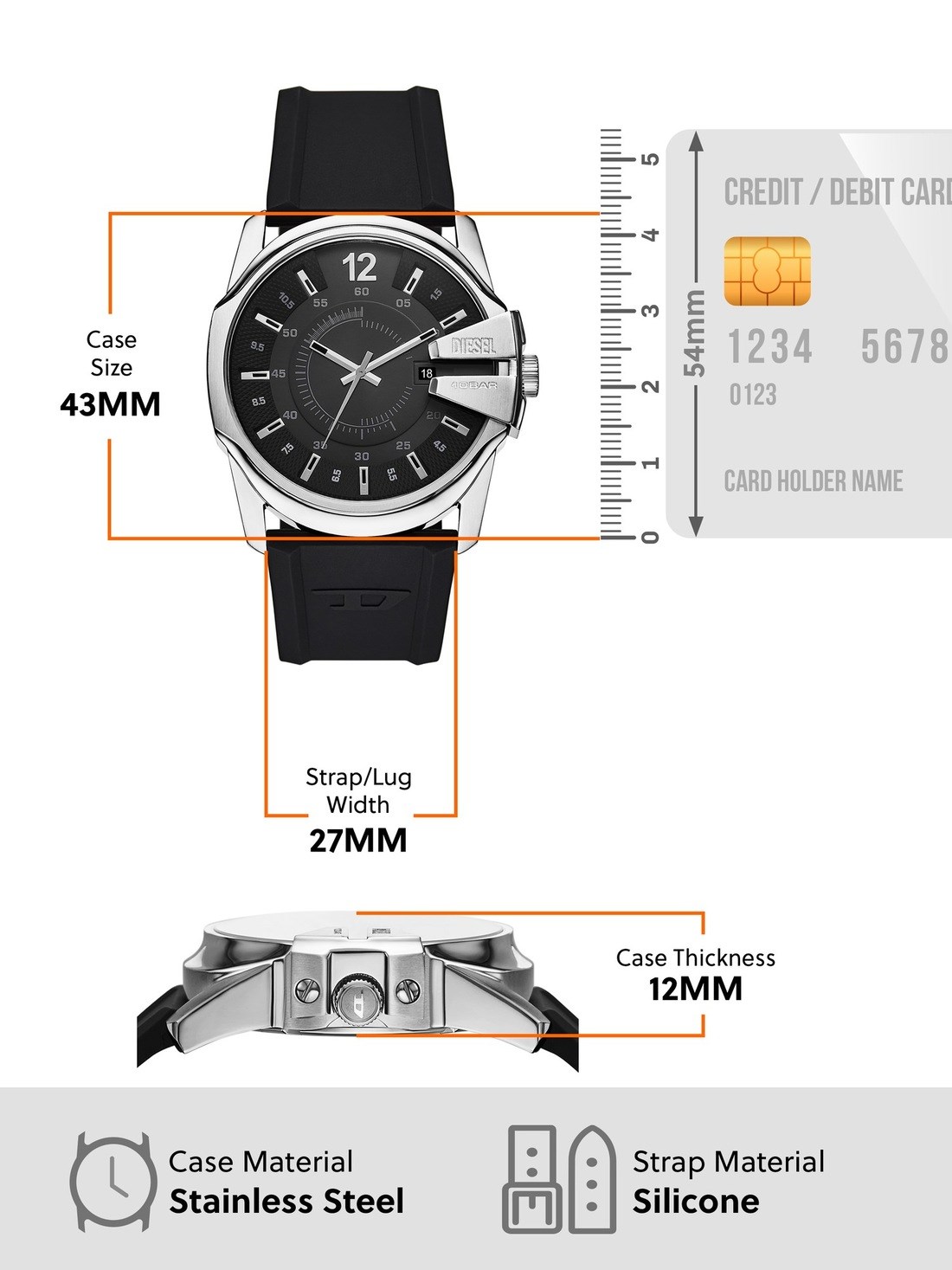 Short Description Diesel's 43mm Master Chief watch features a black sunray dial, three-hand date movement, and a black silicone strap paired with a cord stainless steel D-logo bracelet.