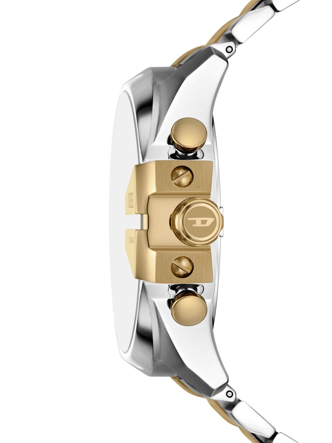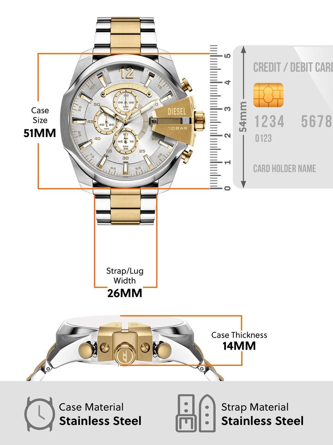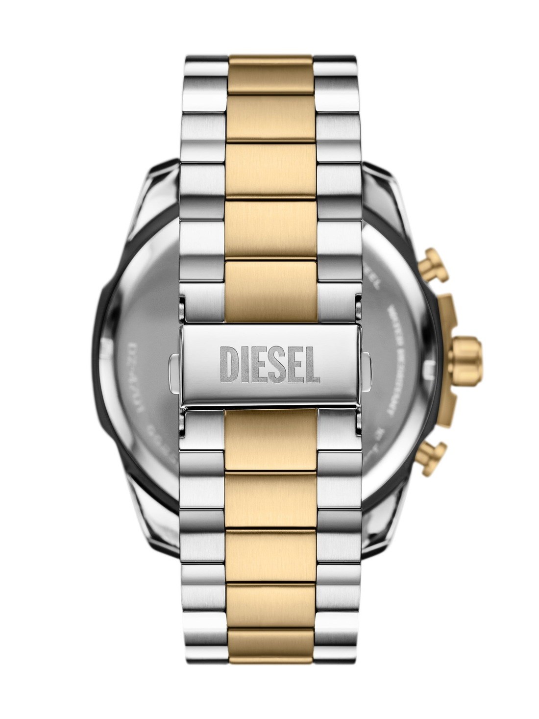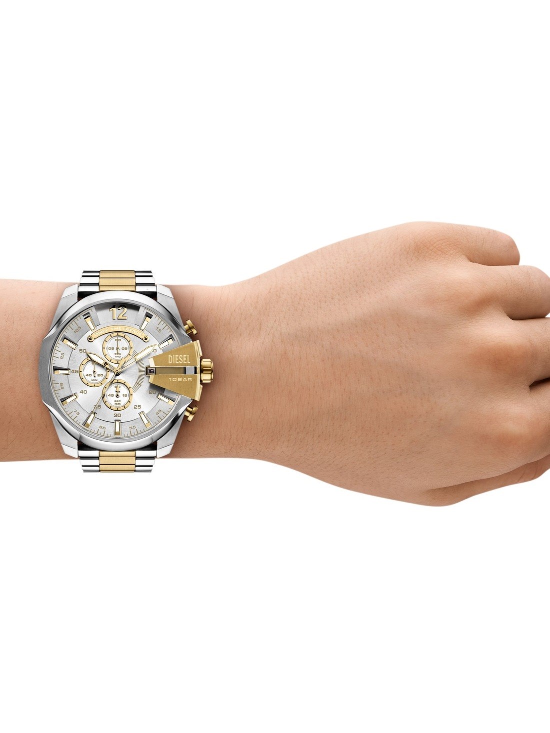 Short Description Diesel's 51mm Mega Chief watch features a two-tone sunray and brushed dial, chronograph movement and gold and silver stainless steel bracelet.