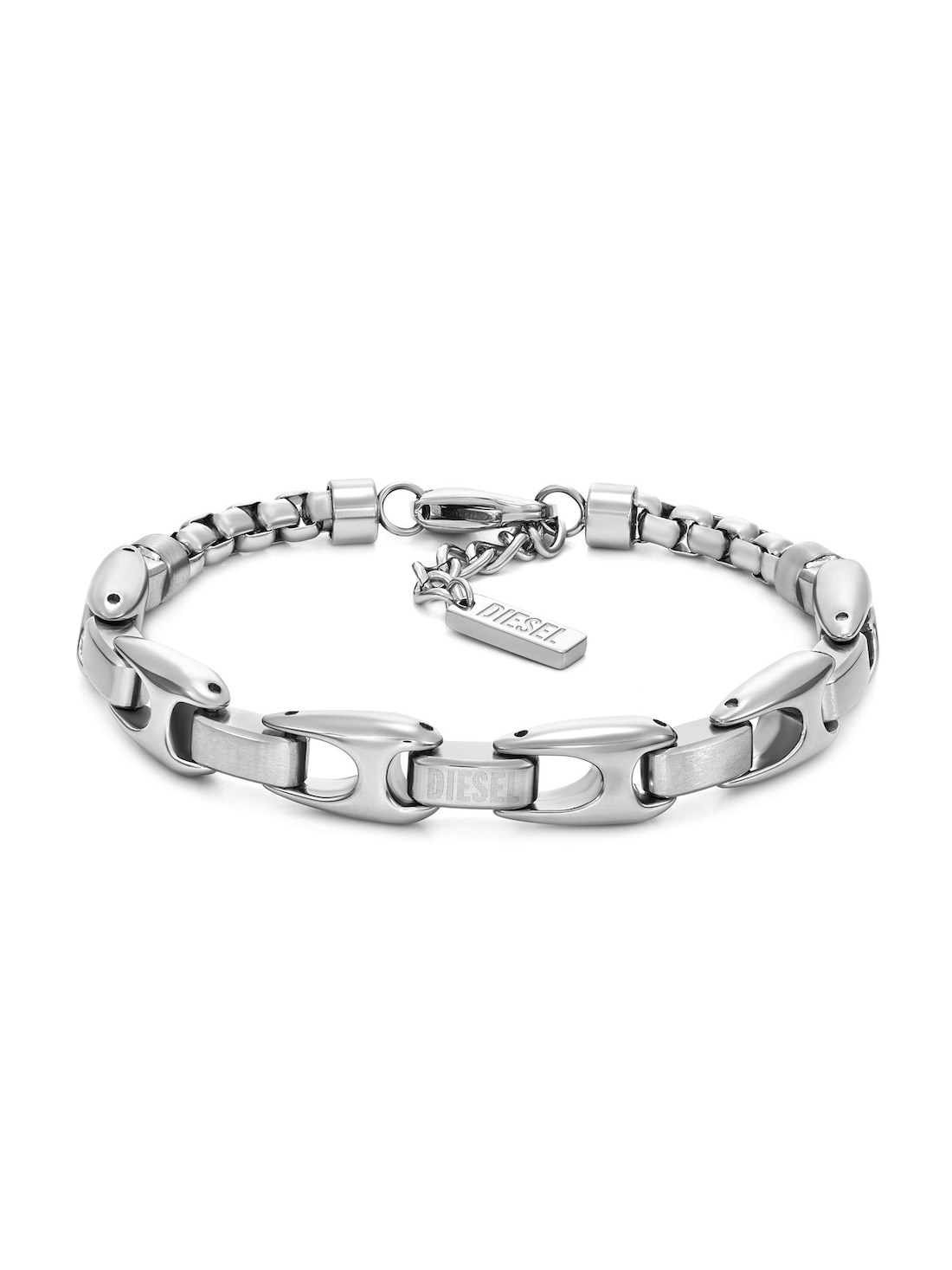Short Description Diesel's silver-tone chain bracelet features stainless steel and bold interlocking links and a small Diesel logo.