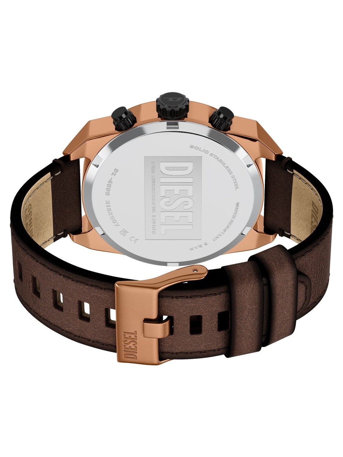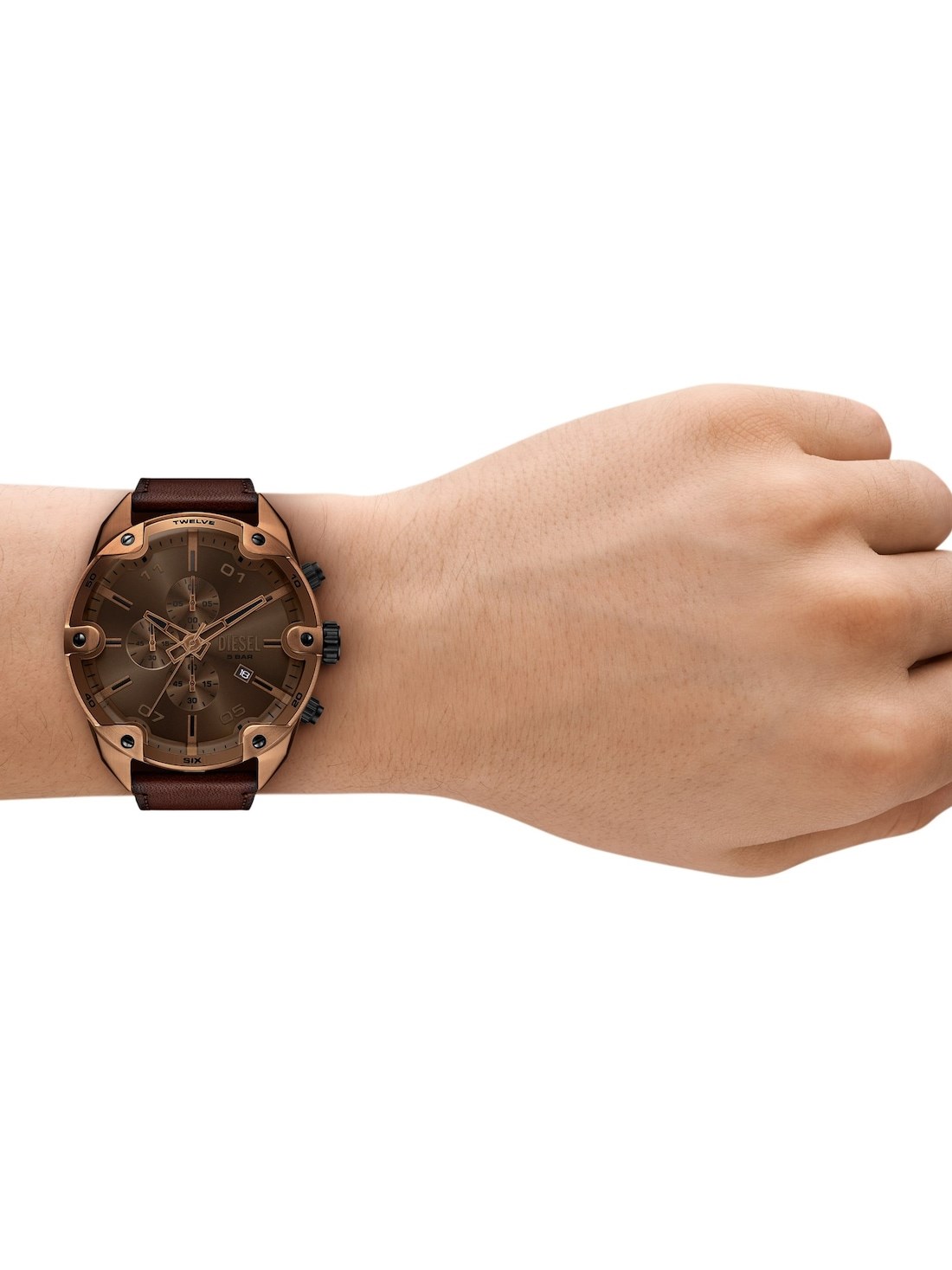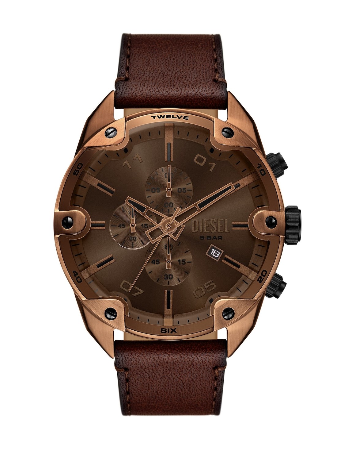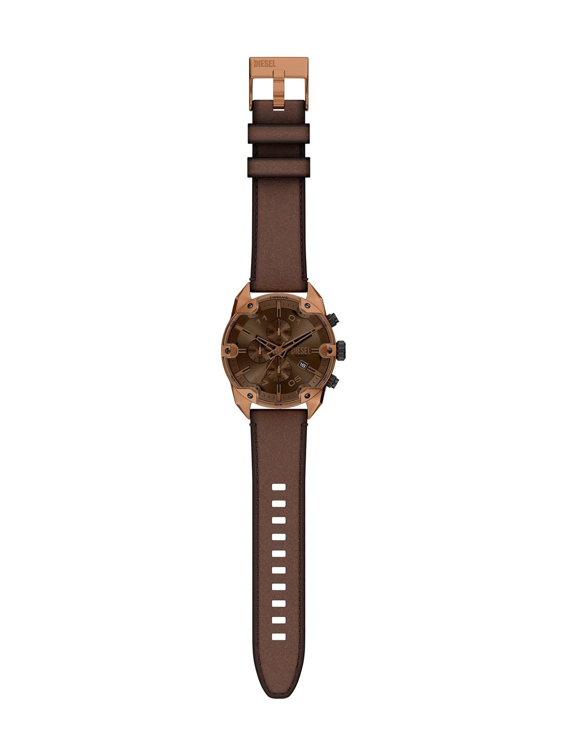 Short Description Diesel's 49mm Spiked watch features a brown sunray polished dial, chronograph movement, and a brown leather strap.