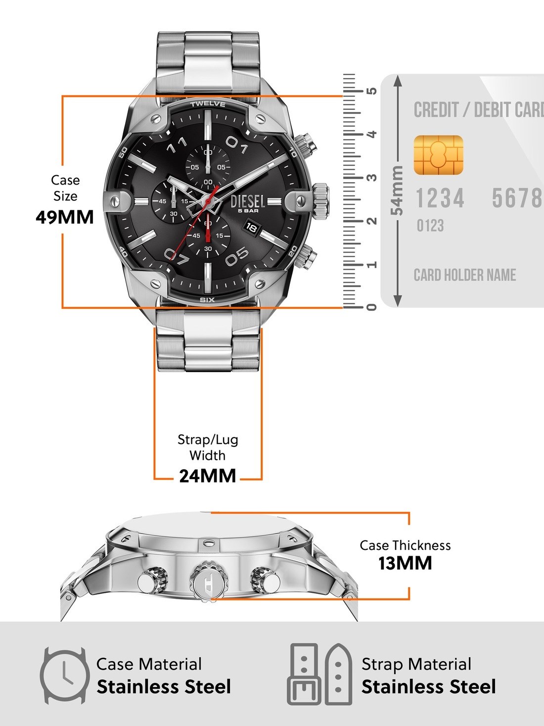 Short Description Diesel’s 49mm Spiked watch features a black sunray dial, chronograph movement, and a silver stainless steel bracelet.