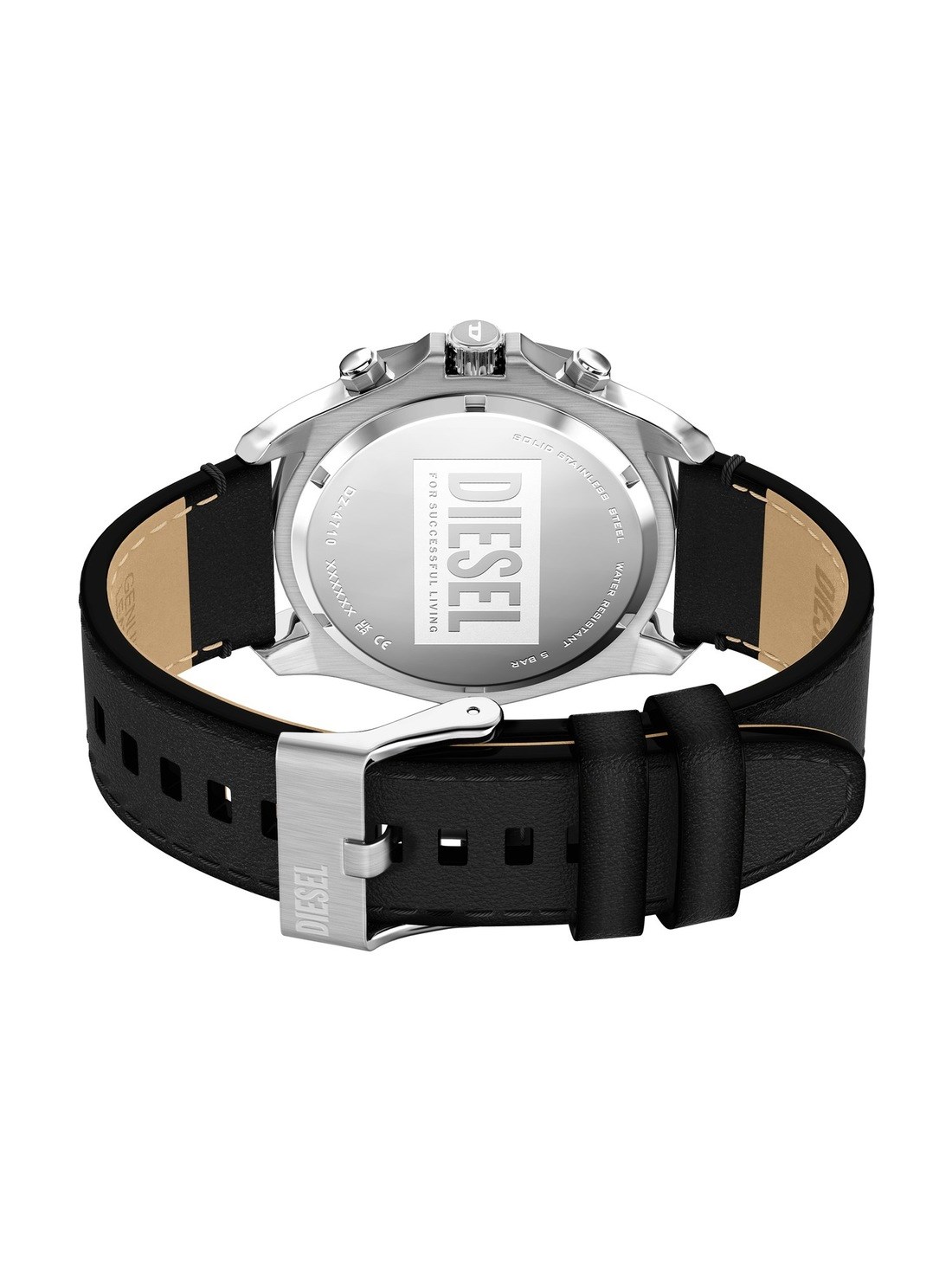 Short Description Diesel’s 46mm Stinger watch features a black sunray dial, chronograph movement, and a black leather strap.