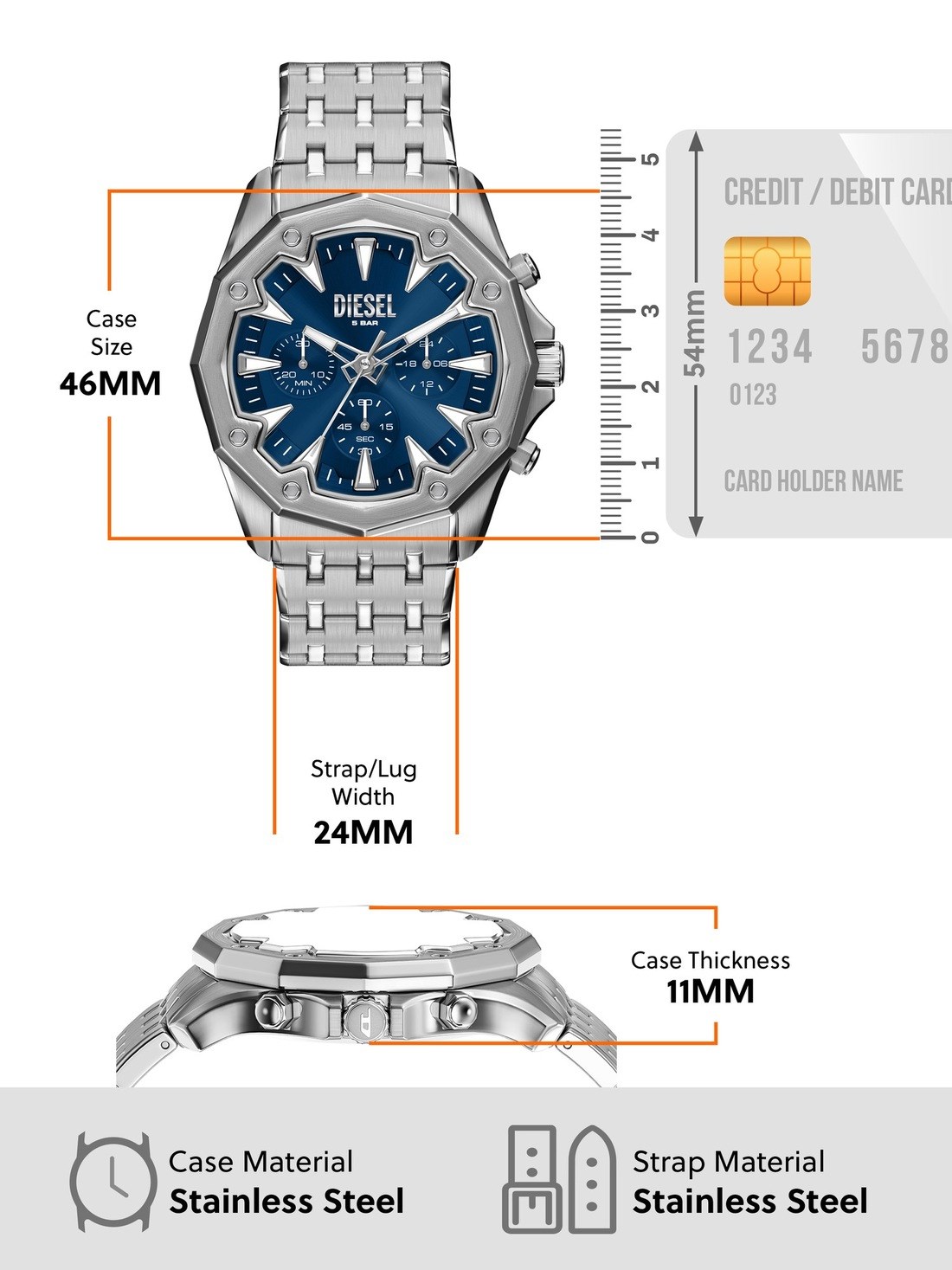 Short Description Diesel’s 46mm Stinger watch features a blue sunray dial, chronograph movement, and a silver stainless steel bracelet.