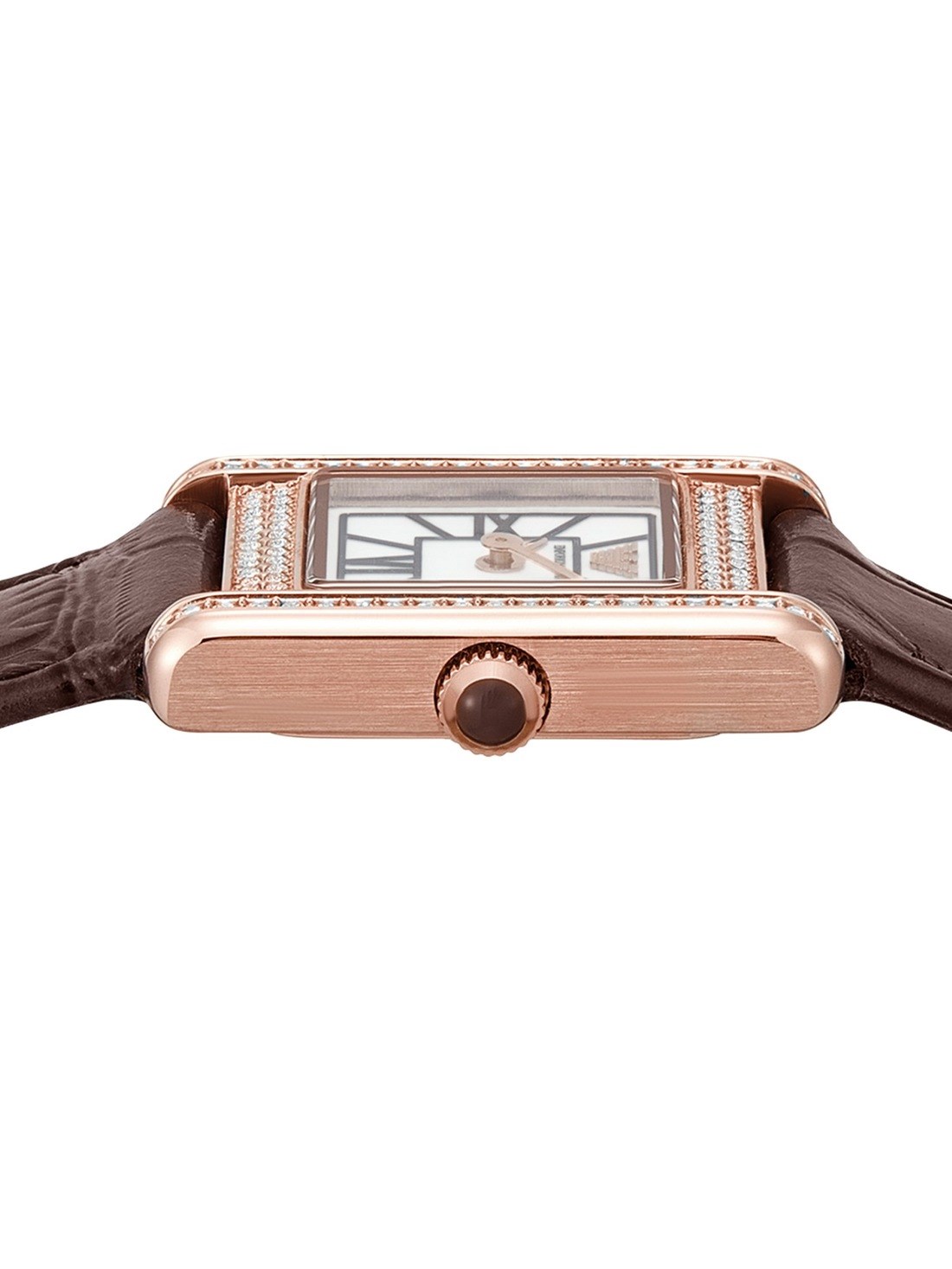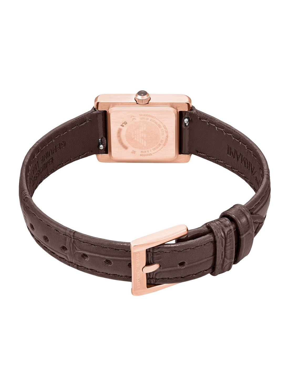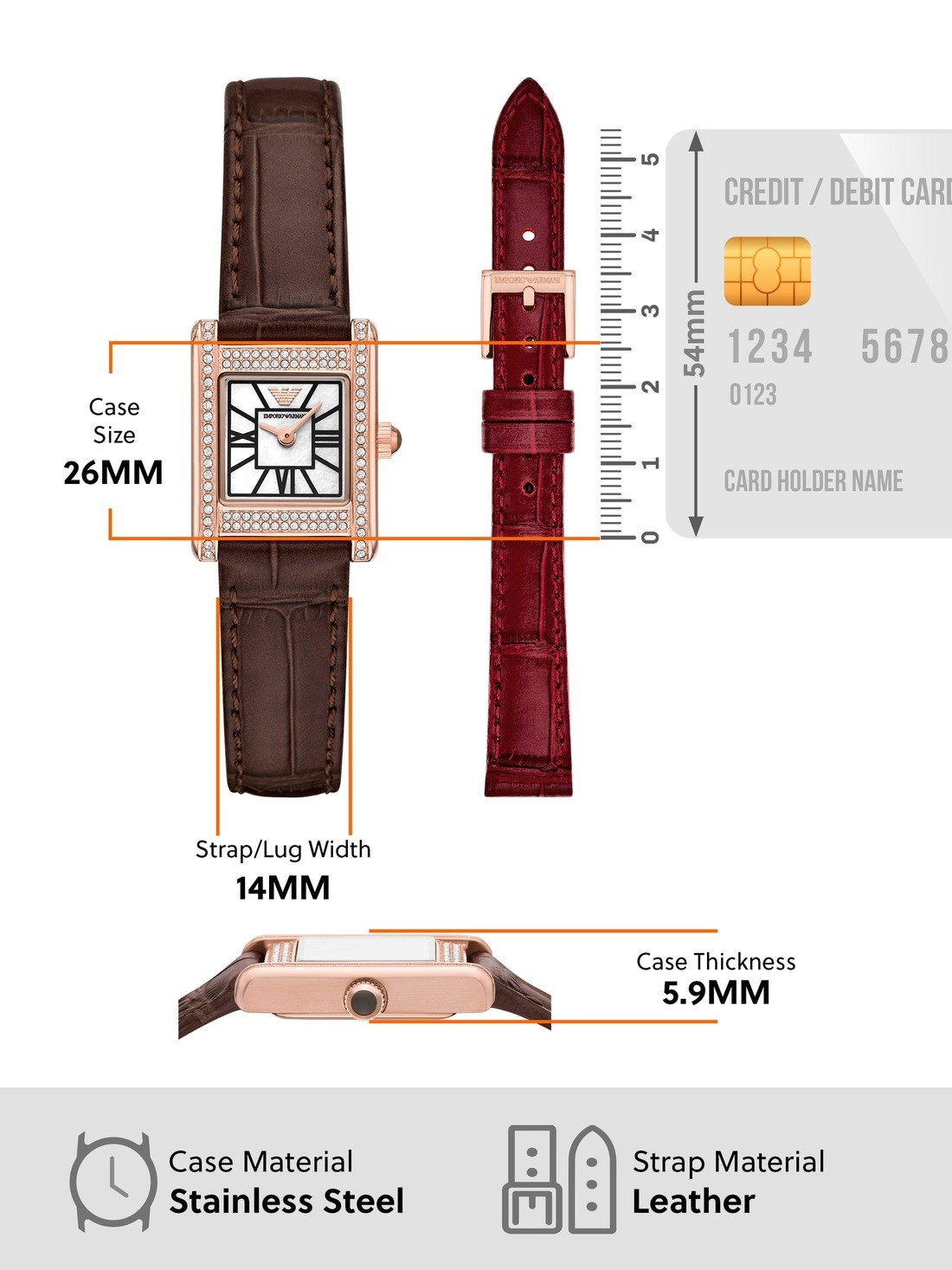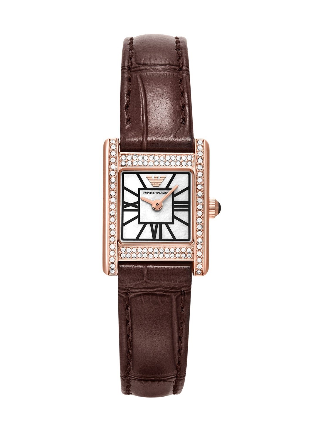 Short Description Emporio Armani's 20 x 26mm watch showcases a white mother of pearl dial with Roman numeral indexes in a rose-gold tone stainless steel case with crystal embellishment. The perfect gift for the season, this watch set comes with both rich brown and deep burgundy interchangeable leather straps to complement any festive look.
