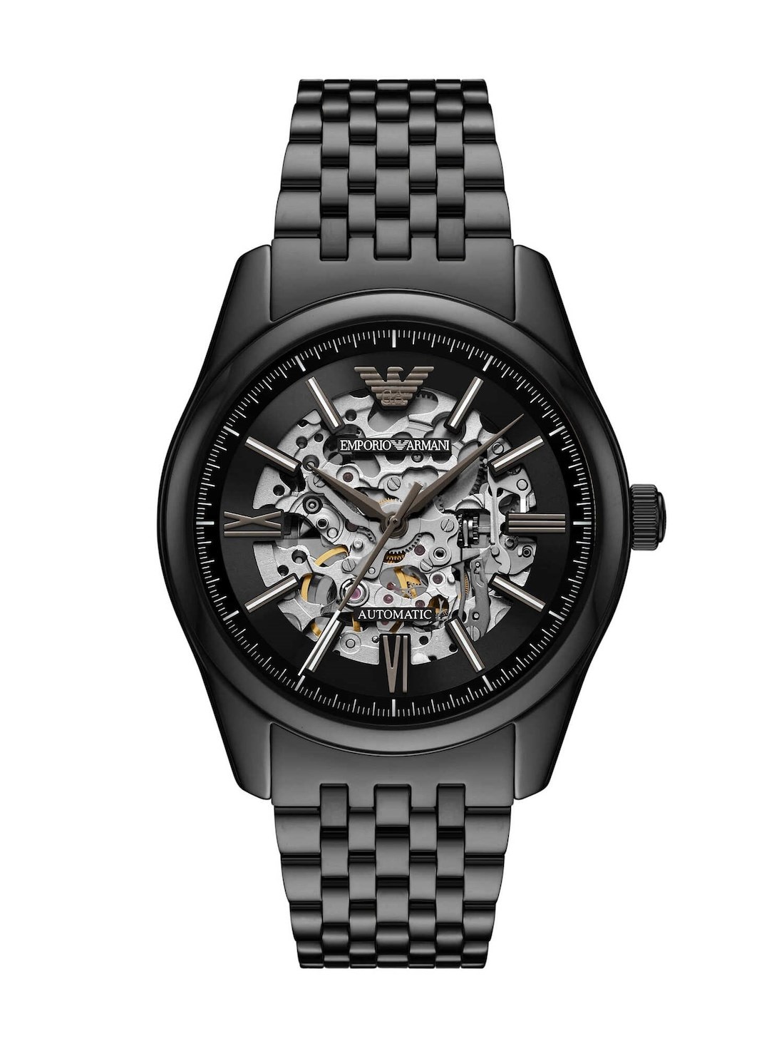 Short Description This open skeleton automatic watch has a 43mm case and black sunray dial. The polished seven link, black stainless steel bracelet, Roman numeral dial and applied branding details make for a truly elevated presentation.