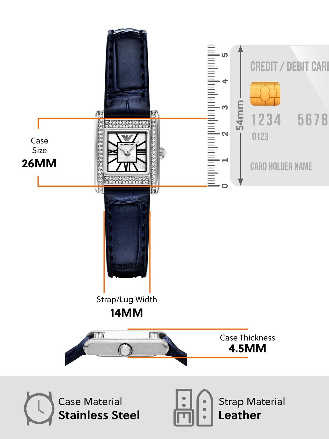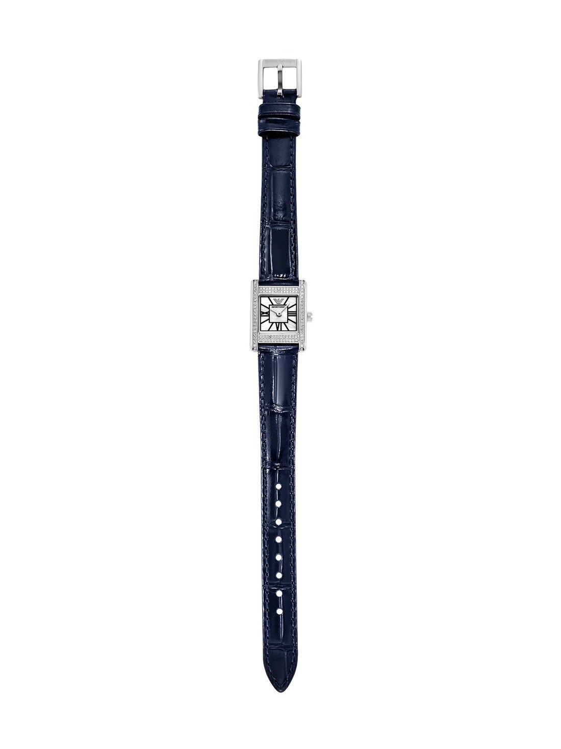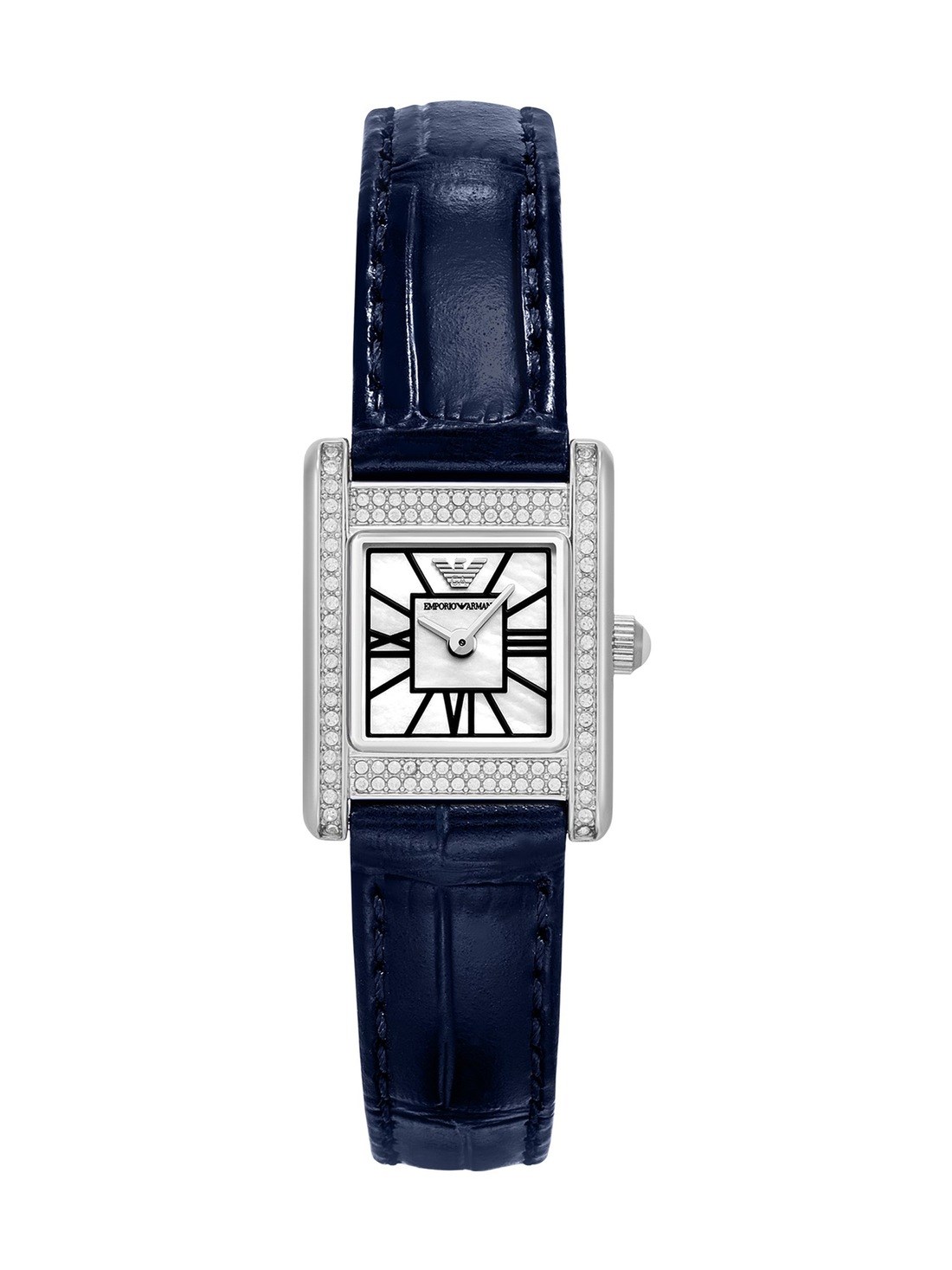 Short Description Emporio Armani's 20 x 26mm watch showcases a white mother of pearl dial with Roman numeral indexes in a stainless steel case with crystal embellishment. The deep blue, crocodile patterned leather strap ensures a refined look for your collection.