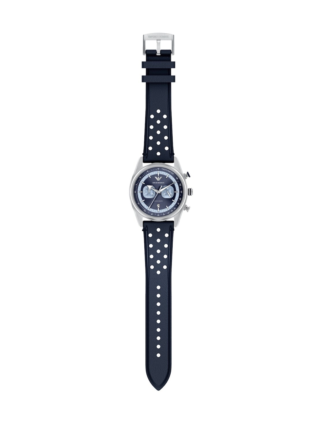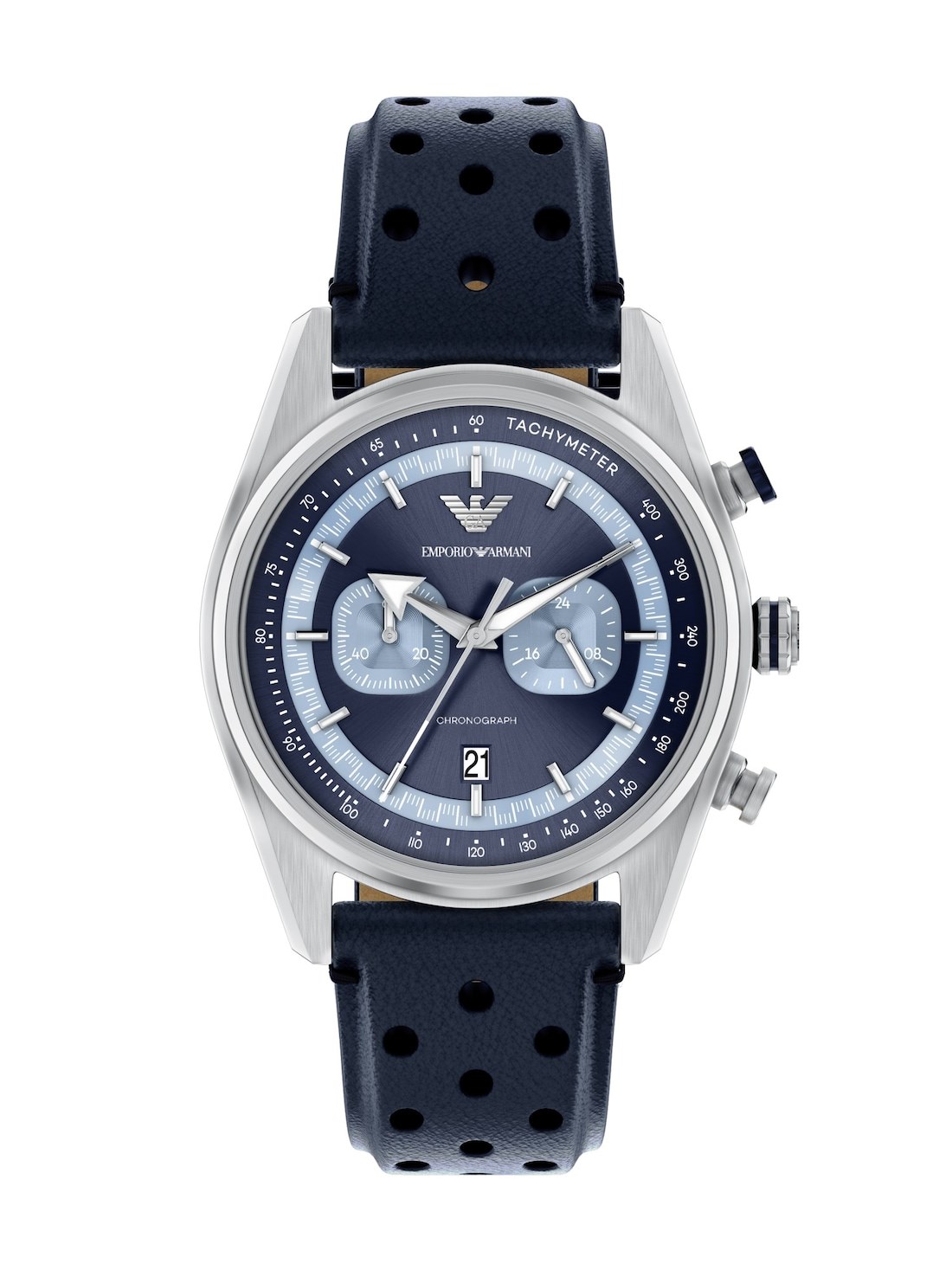 Short Description Emporio Armani's 42mm watch features a round, stainless steel case with a dark blue sunray dial accented by bright blue CD-textured subeyes. The Japanese chronograph movement ensures accurate timekeeping with a functional tachymeter to measure your speed over distance traveled. The dark blue perforated leather strap pays homage to the sport-inspired heritage of this timepiece.