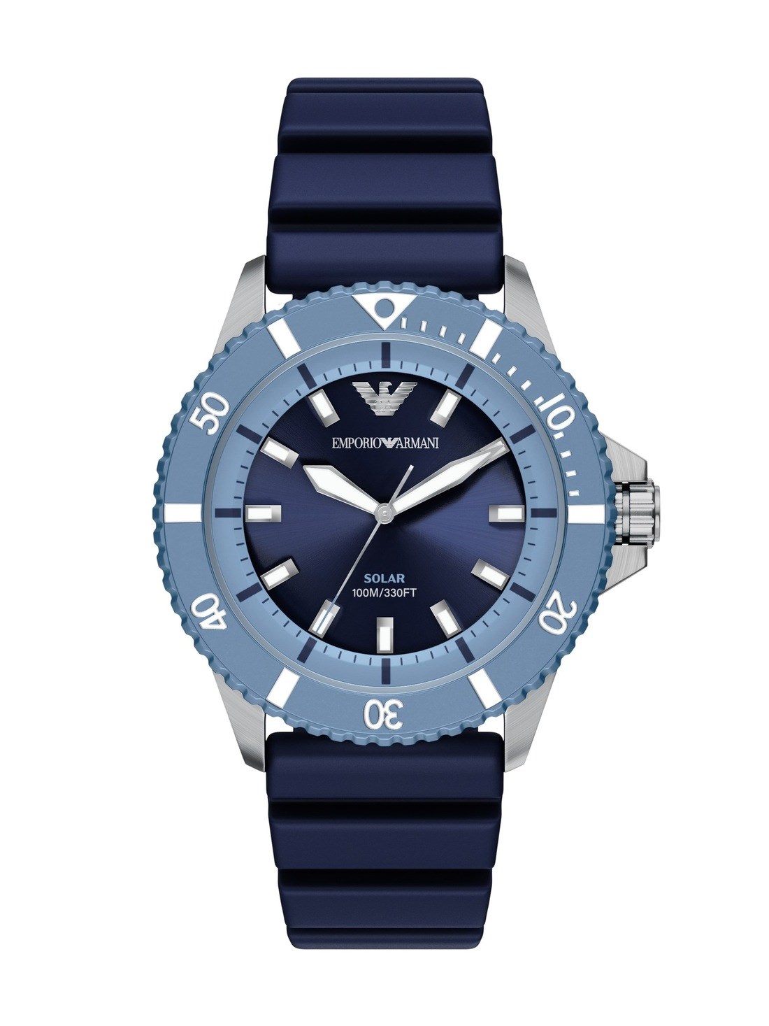 Short Description Emporio Armani's 42mm World Explorer solar-powered three-hand watch with sapphire crystal brings a fresh energy this spring, featuring a blue sunray dial and silicone strap accented by a bioplastic bezel. Its Japanese solar-powered movement ensures reliability and eliminates the need for frequent battery replacements. This watch can run for up to 4 months on one full charge.