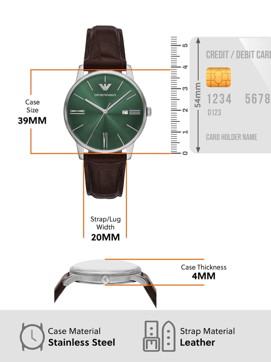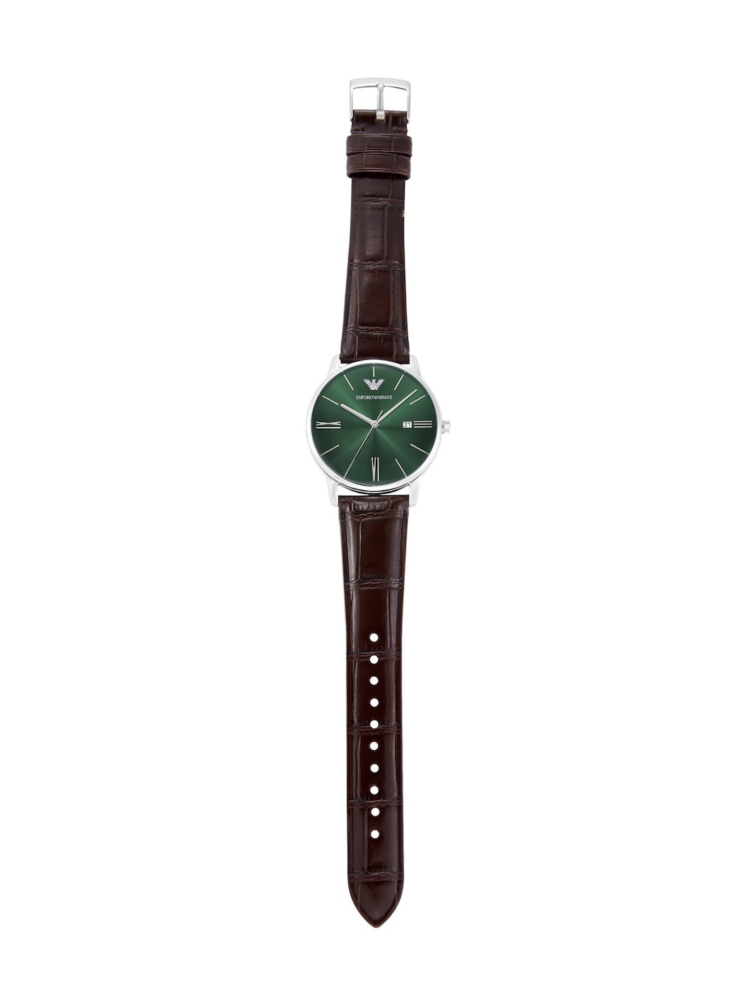 Short Description Emporio Armani's 39mm watch features a striking green sunray dial, in a stainless steel case with a three-hand date movement. The domed crystal over the dial gives this watch a distinct edge paired with its unique, brown crocodile-patterned leather strap.