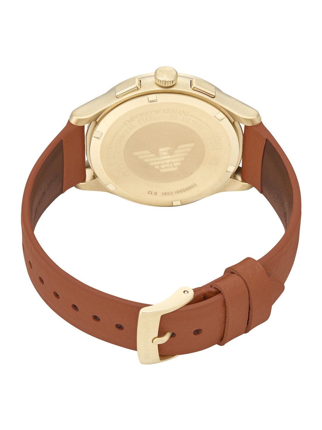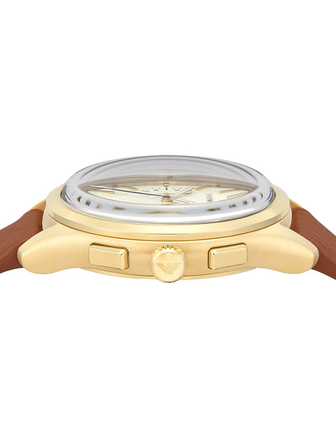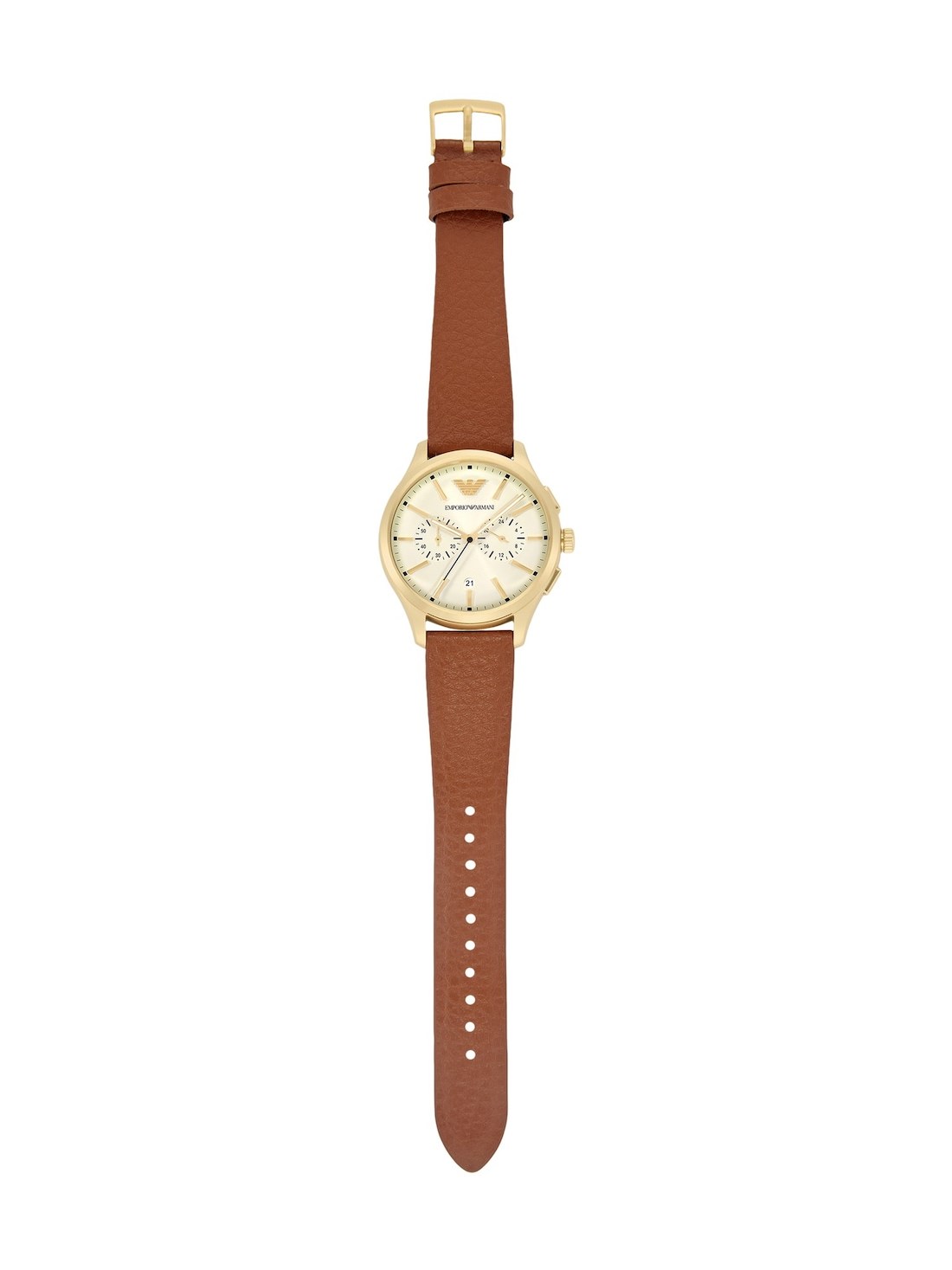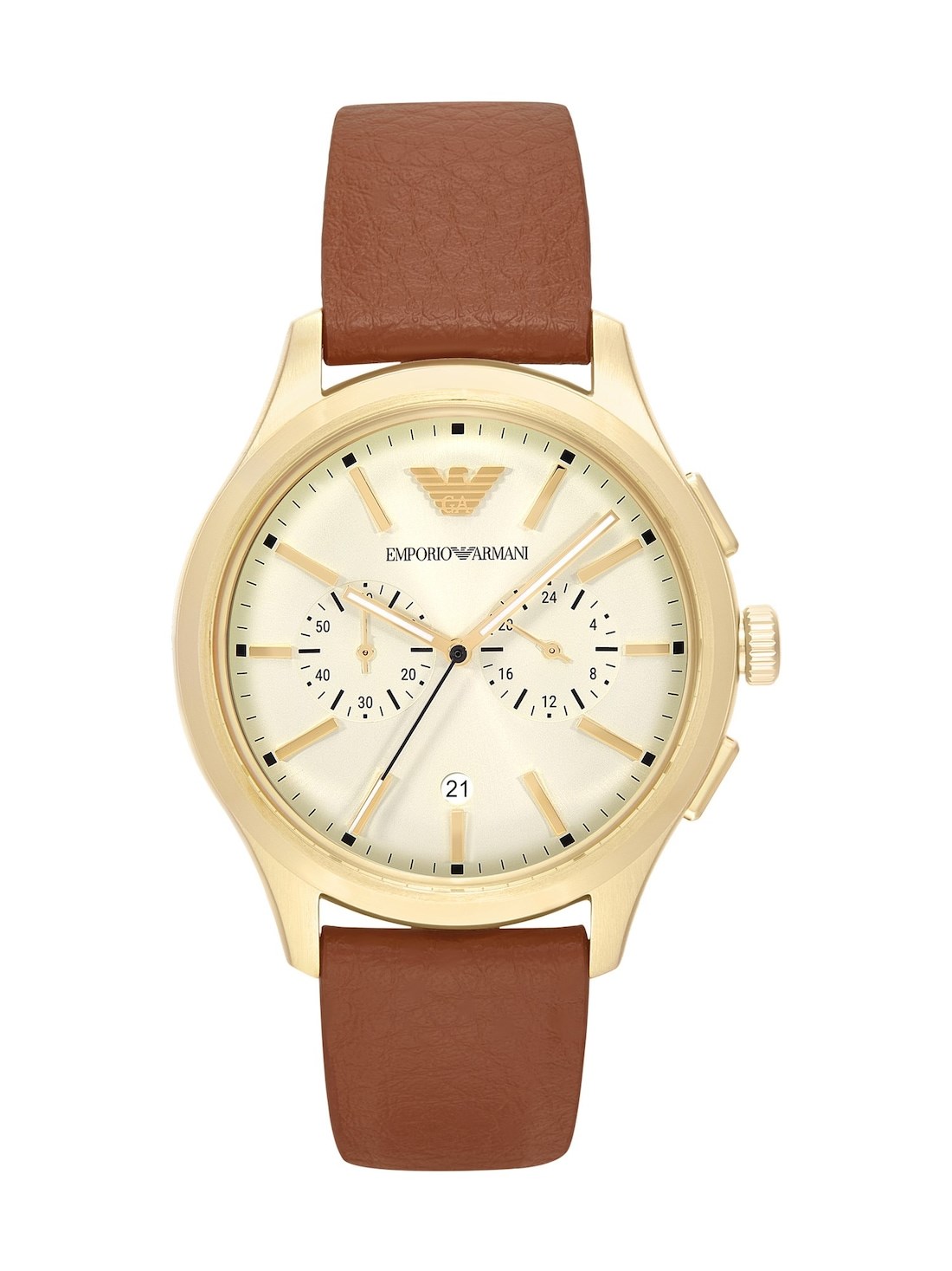 Short Description This 42mm chronograph watch with a Japanese movement features a brown leather strap. This watch has added functionality with two sub-eyes on a cream sunray dial set in a round gold-tone stainless steel case.