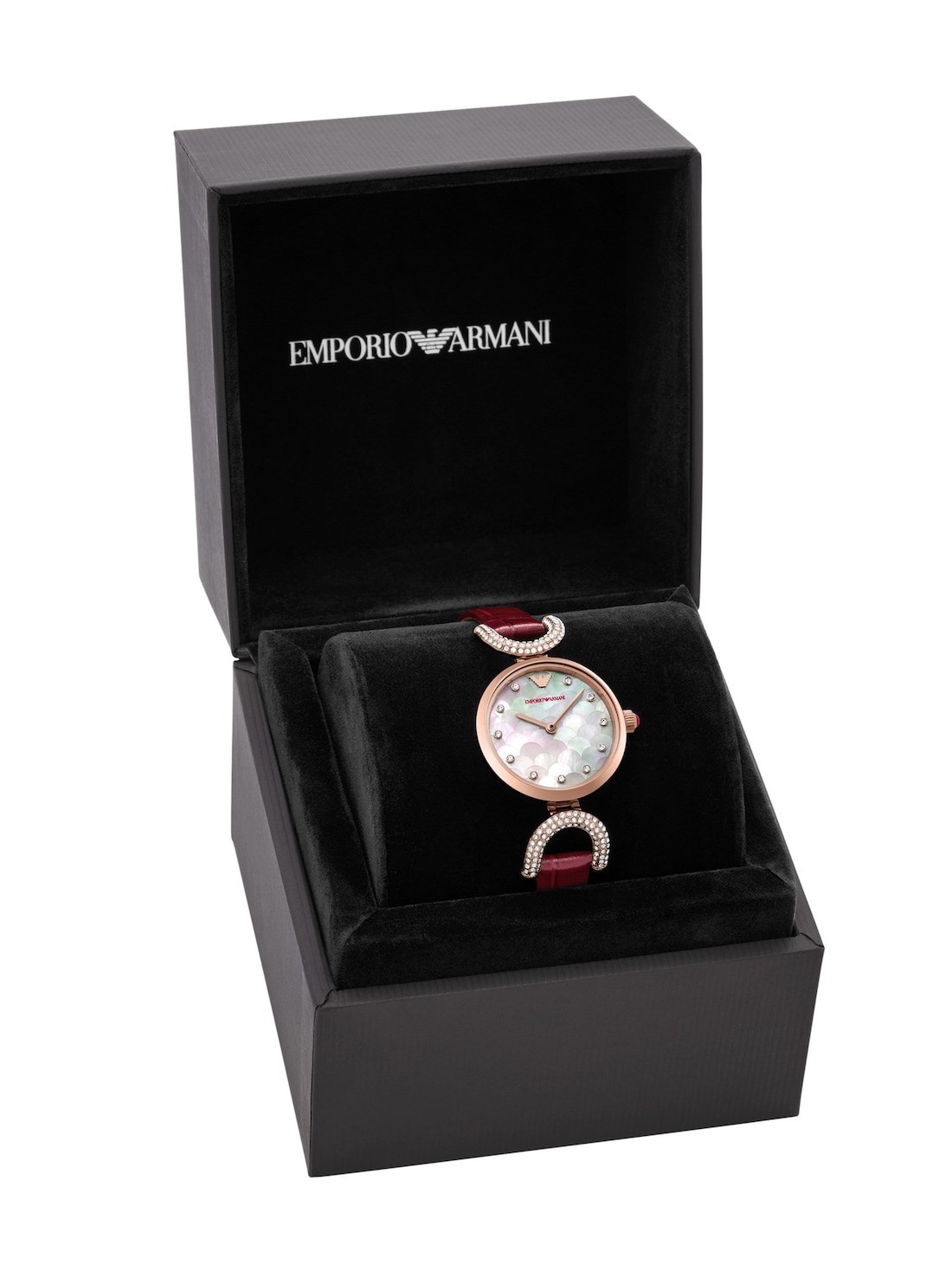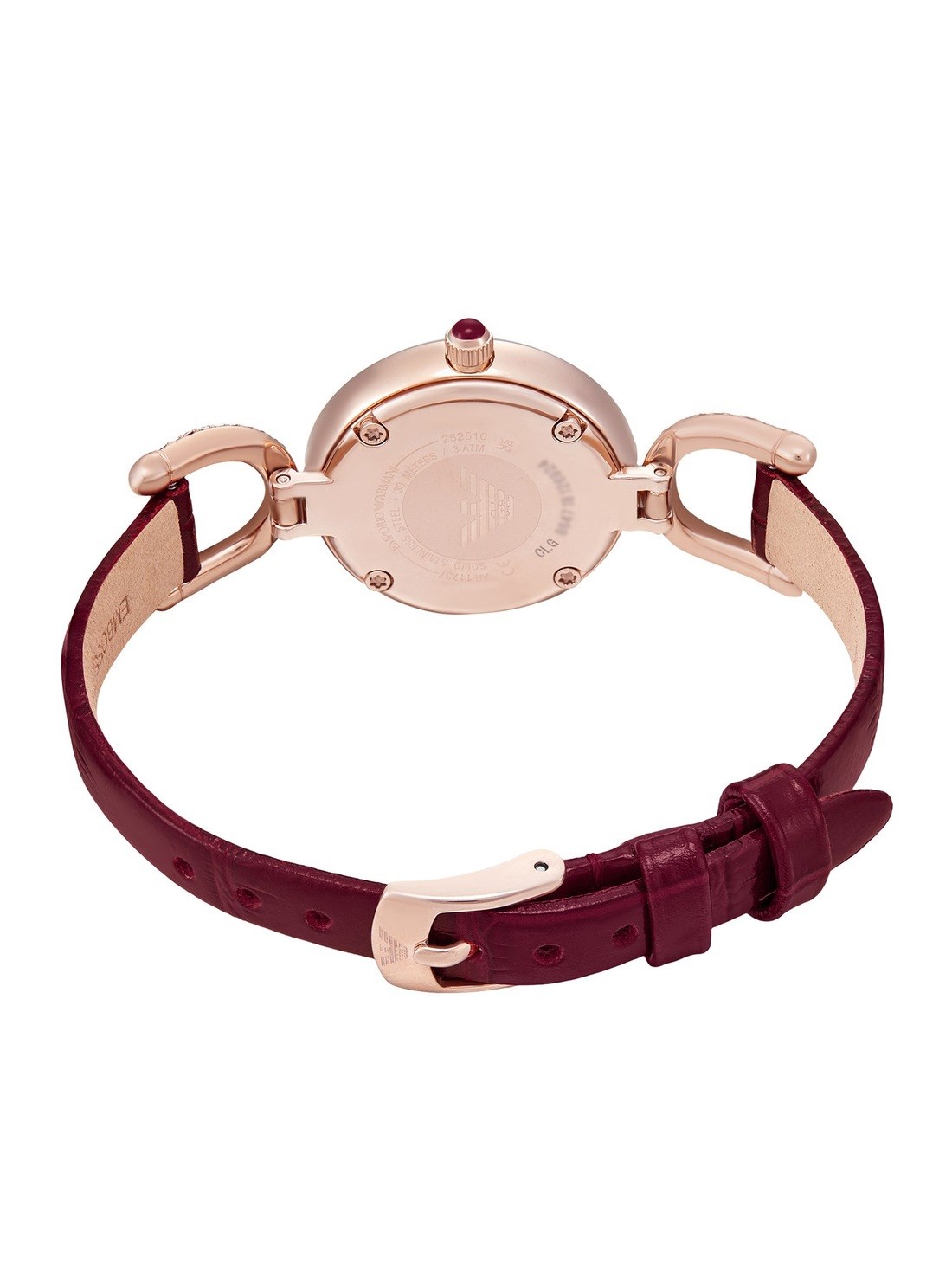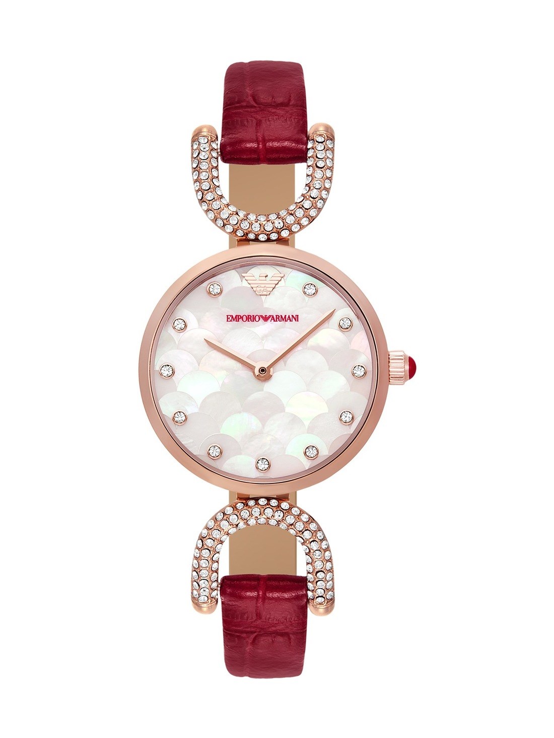 Short Description This watch features a white mother of pearl dial with a scalloped pattern set against a rose-gold tone stainless steel case with crystal indexes paired with a rich burgundy leather strap. The horseshoe-shaped crystal lugs are a special nod to the Year of the Horse.
