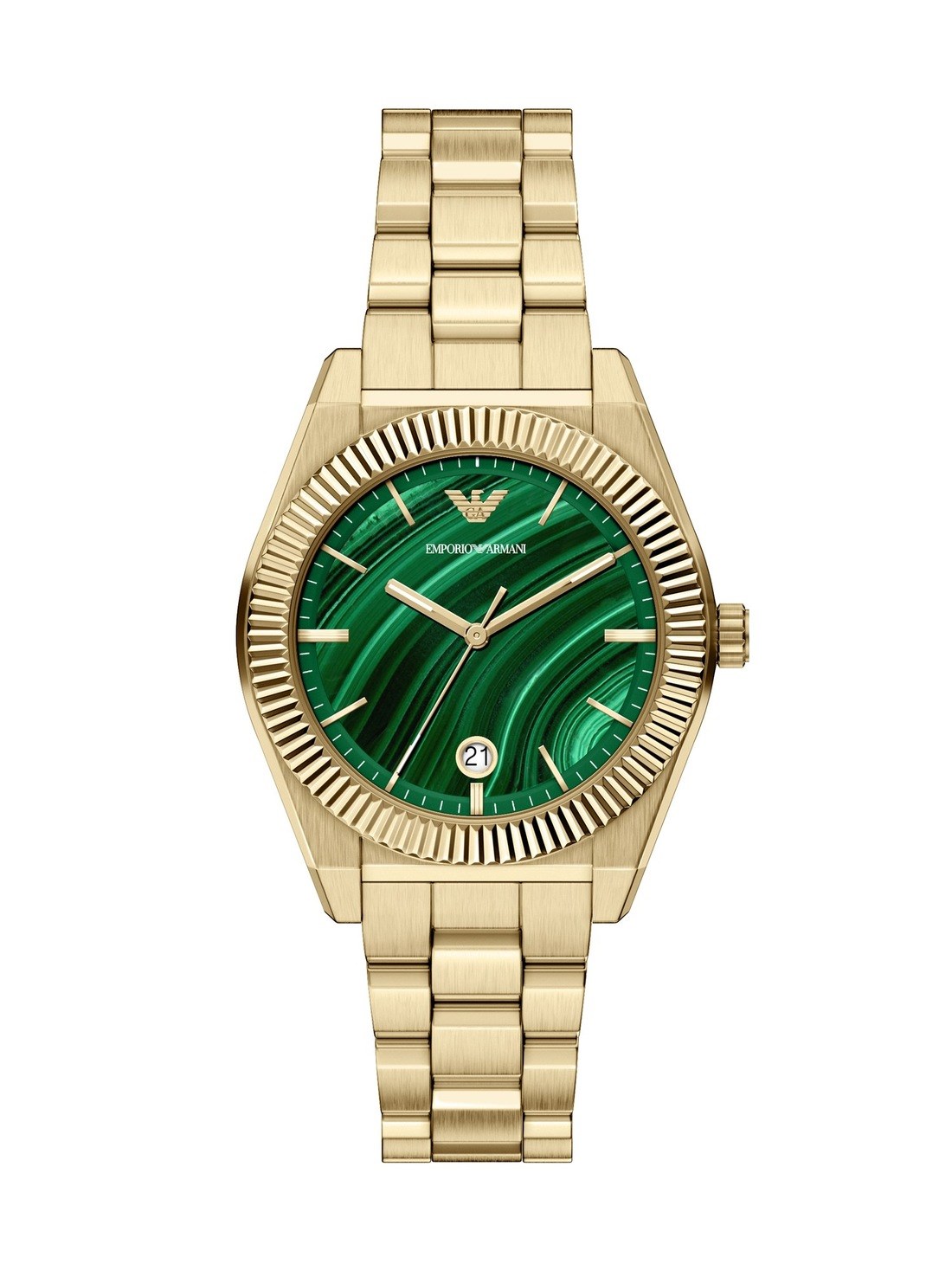 Short Description Emporio Armani's 37MM watch features a malachite semi-precious stone dial, three-hand date movement, and a gold-tone stainless steel bracelet. The fluted gold-tone stainless steel bezel adds an element of visual intrigue, making the perfect complement to the structured watch case and bracelet.