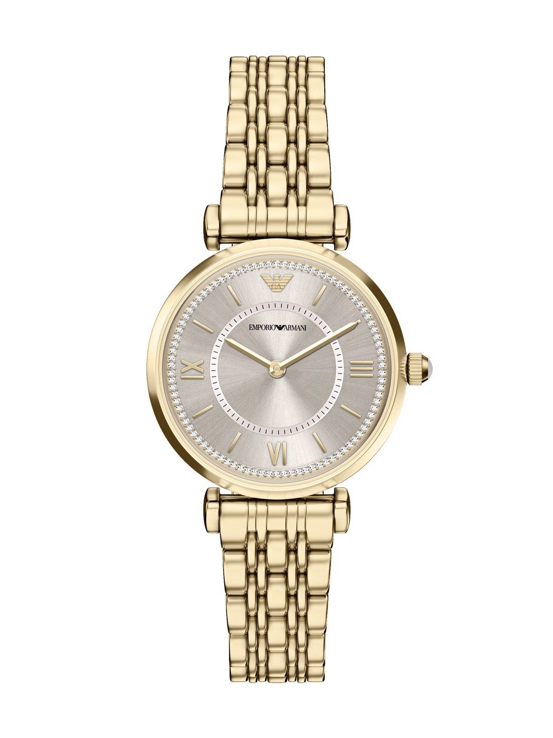 Short Description Emporio Armani's 32MM watch features a beige gold sunray dial with a crystal inlay around the outer rim. Pale gold-tone Roman numeral indexes adorn the dial set on a pale gold-tone stainless steel case and intricate bracelet.