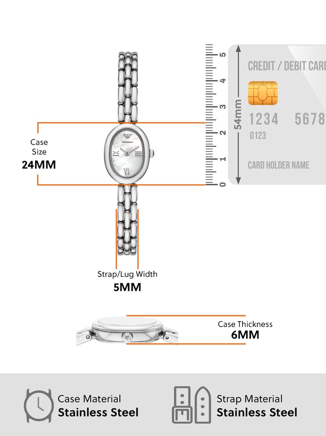 Short Description Emporio Armani's 18 x 24mm watch showcases a white mother-of-pearl dial with Roman numeral indexes on an intricate, multilink stainless steel bracelet. The petite oval silhouette makes this watch the ideal dress accessory.