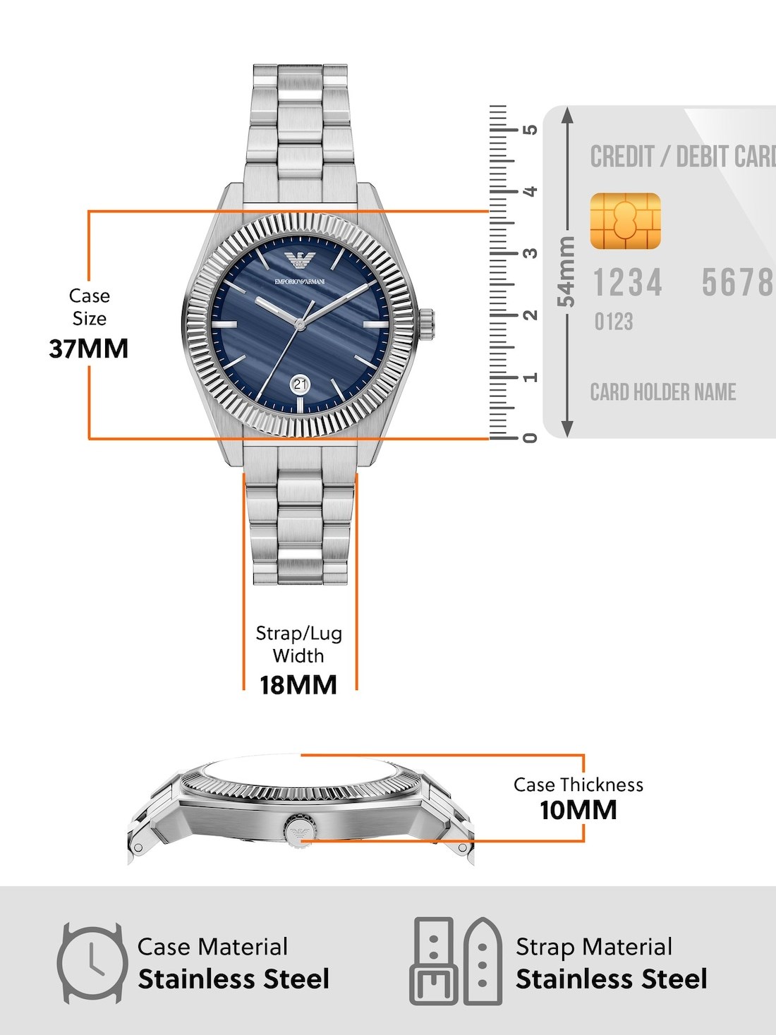 Short Description Emporio Armani's 37MM watch features a blue meteorite semi-precious stone dial, three-hand date movement, and a stainless steel bracelet. The fluted stainless steel bezel adds an element of visual intrigue, making the perfect complement to the structured watch case and bracelet.