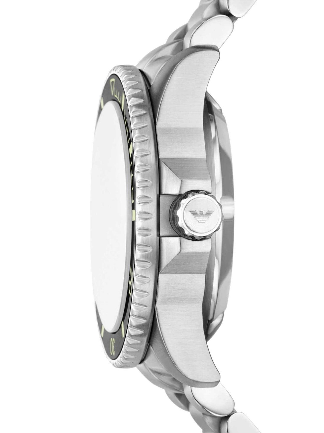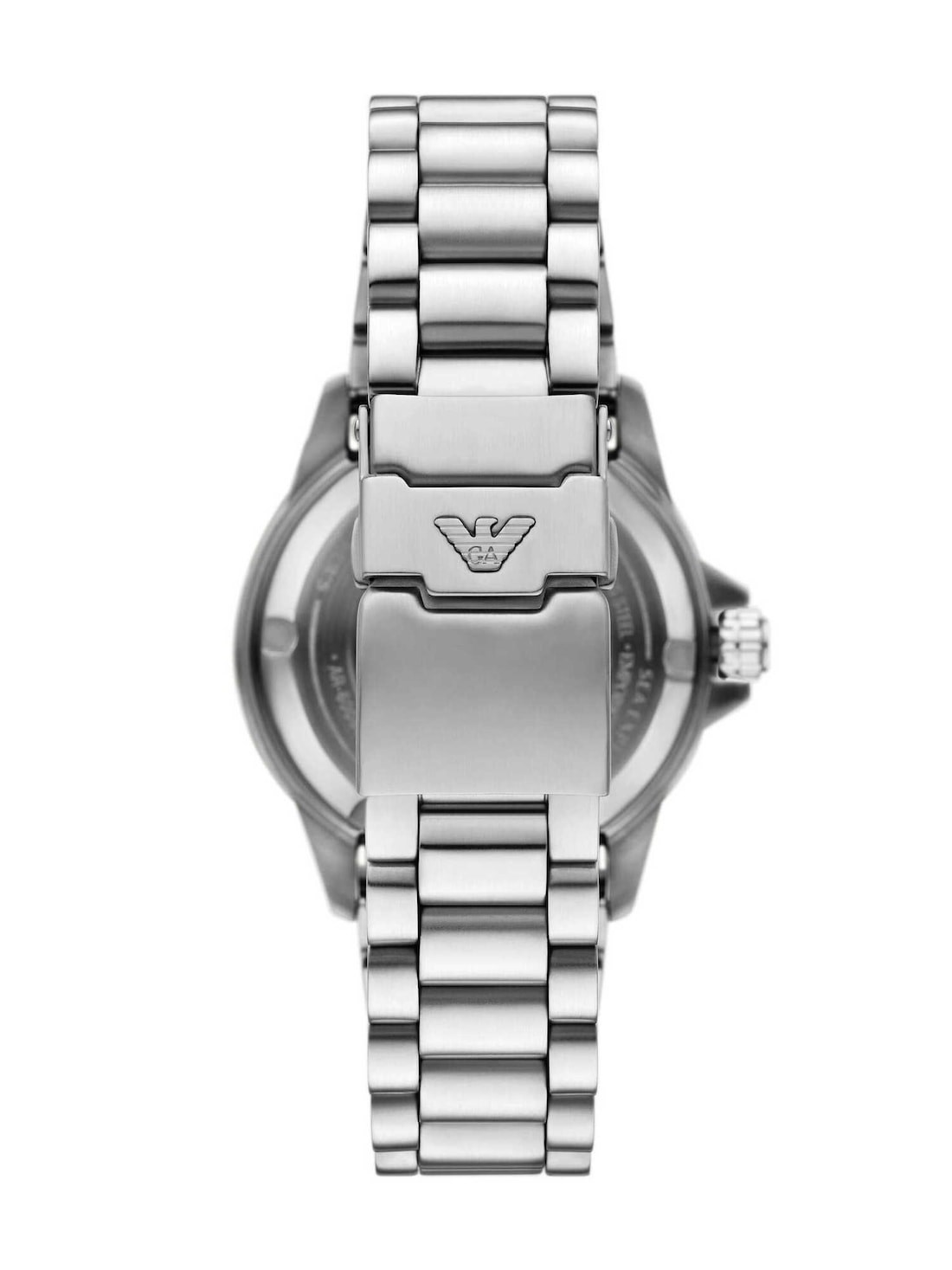 Short Description Emporio Armani's Sea Explorer is a 42.5mm automatic dive watch featuring sapphire crystal and Super-LumiNova® on hands, indexes and bezel markings for optimal visibility in dark underwater conditions. As indicated by the 'Diver's' marking on the dial, this watch is ISO 6425 certified, making it expertly equipped for deep-sea diving up to 200 meters. This iteration boasts a glossy blue enamel dial and an integrated stainless steel bracelet.