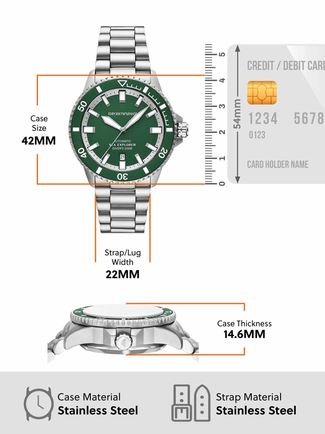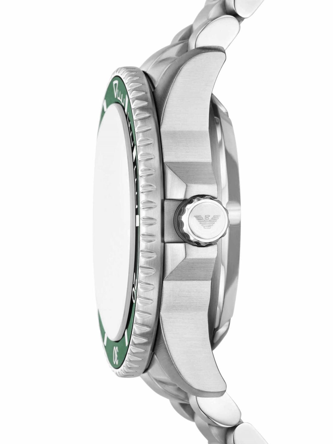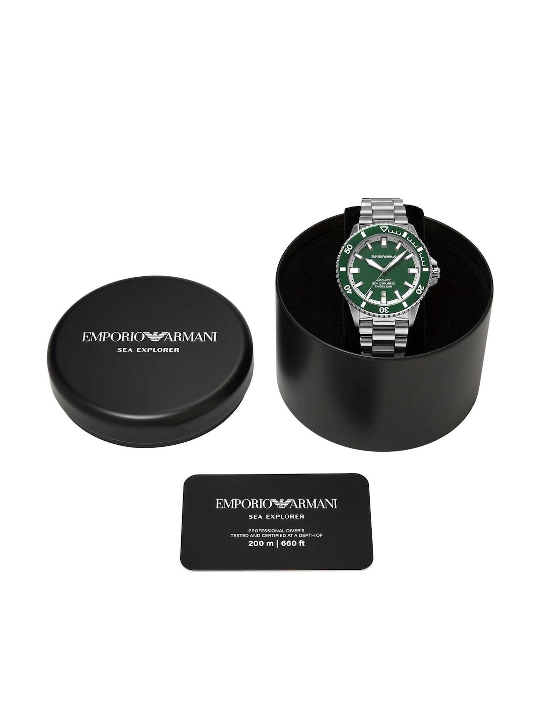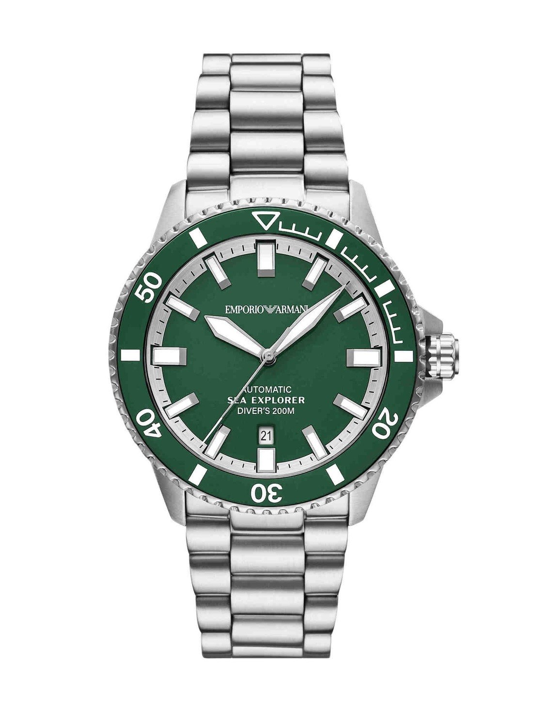 Short Description Emporio Armani's Sea Explorer is a 42.5mm automatic dive watch featuring sapphire crystal and Super-LumiNova® on hands, indexes and bezel markings for optimal visibility in dark underwater conditions. As indicated by the 'Diver's' marking on the dial, this watch is ISO 6425 certified, making it expertly equipped for deep-sea diving up to 200 meters. This iteration boasts a glossy green enamel dial and an integrated stainless steel bracelet.