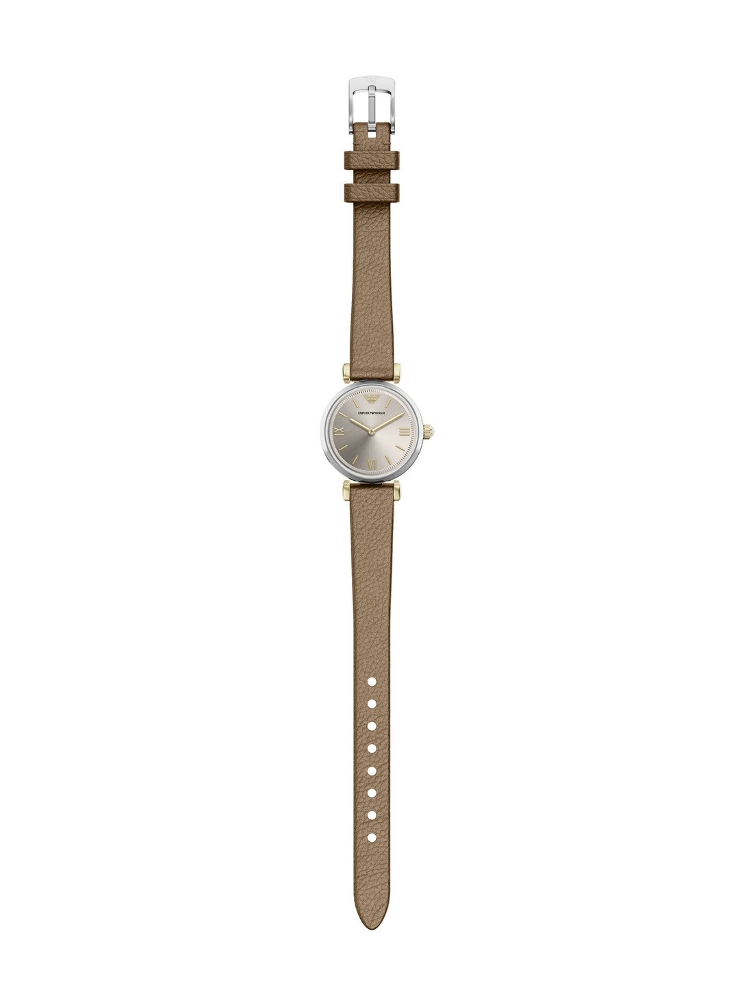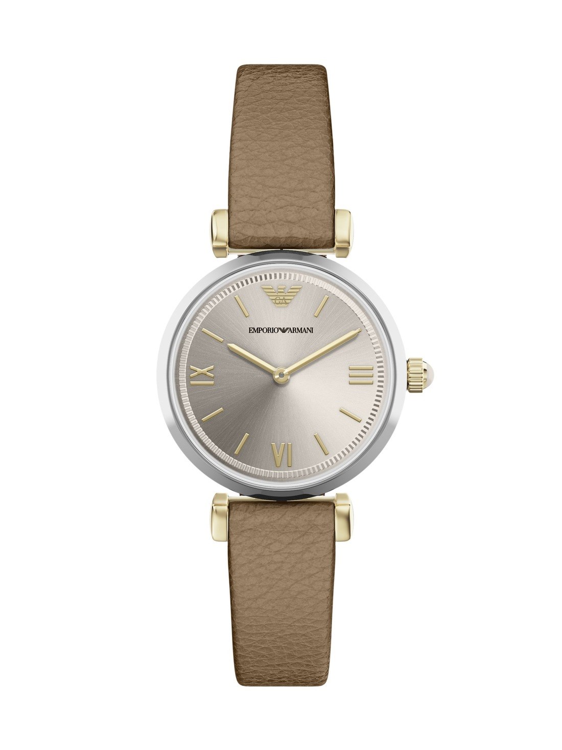Short Description Emporio Armani's 28mm two-tone stainless steel watch with a two-hand movement showcases a champagne sunray dial with a textured edge. Adorned with gold-tone Roman numeral indexes and a taupe leather strap, this watch is an elegant complement to any collection.