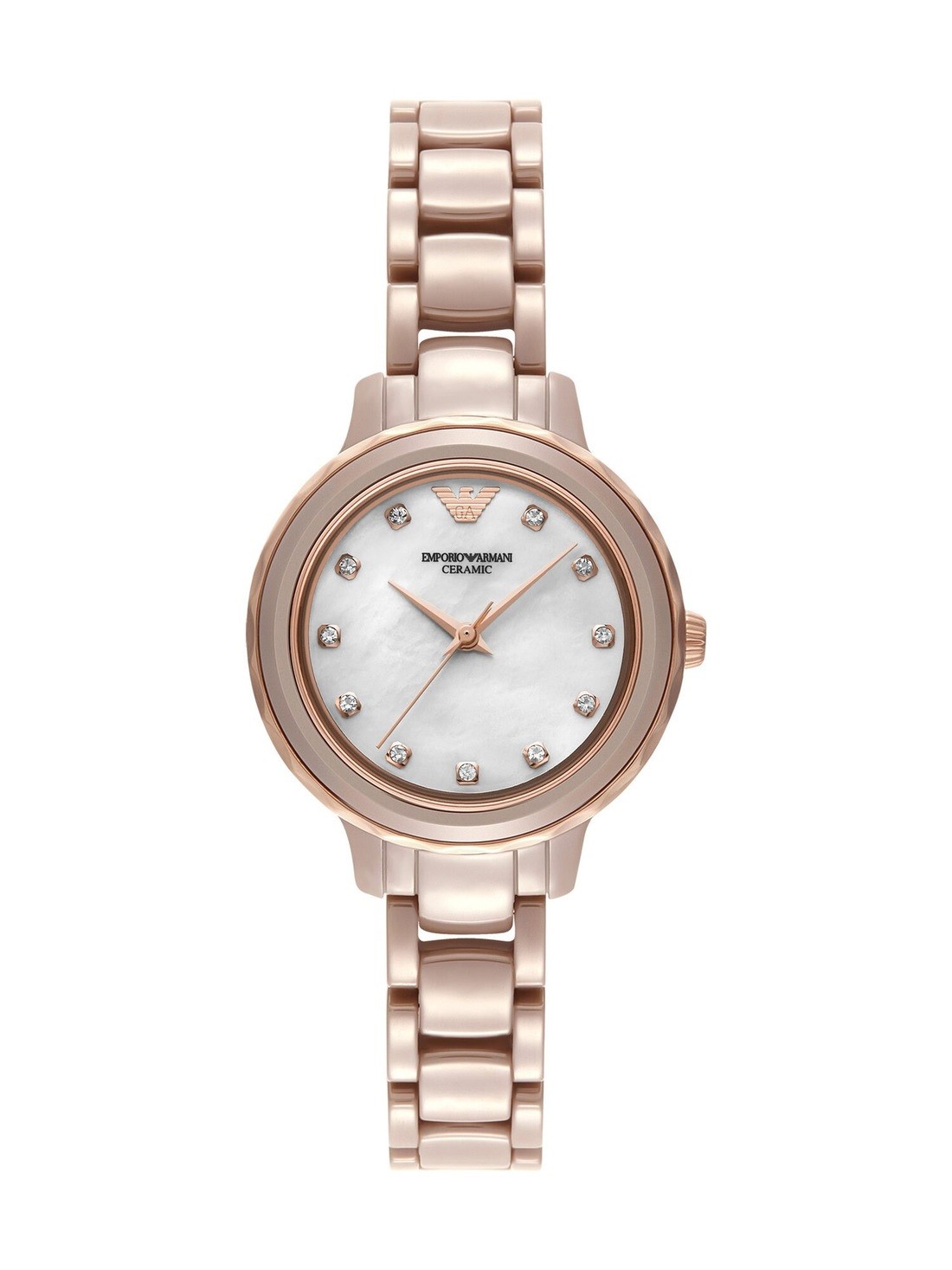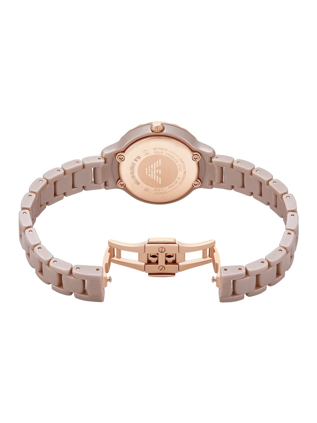 Short Description Crafted entirely from sand-colored ceramic, this watch showcases a white mother-of-pearl dial with crystal indexes featuring rose gold-tone accents. The scalloped ceramic bezel with rose-gold tone detailing and matching ceramic bracelet make for a visual delight that is perfect for any woman.