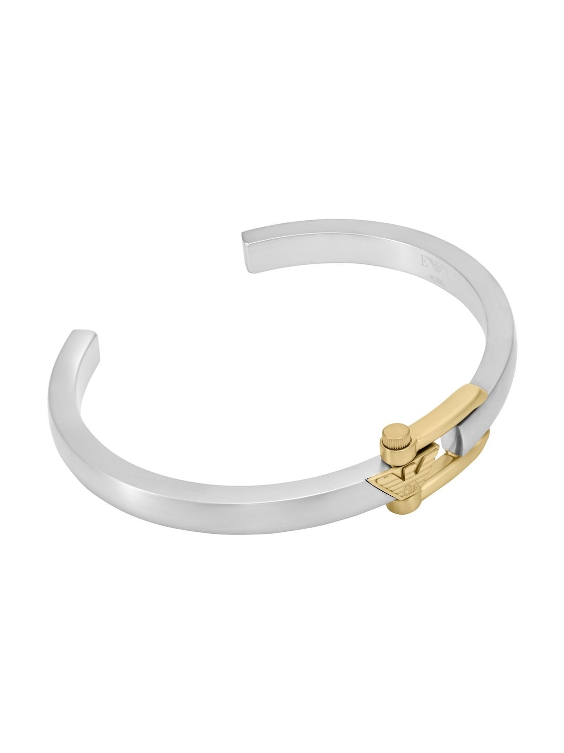Short Description Crafted from stainless steel with a refined two-tone finish, this cuff bracelet combines polished and brushed textures for a sleek, modern look. The open design eliminates the need for a clasp and ensures effortless wear. Signature Emporio Armani detailing adds a subtle, yet distinctive, touch to this streamlined accessory.