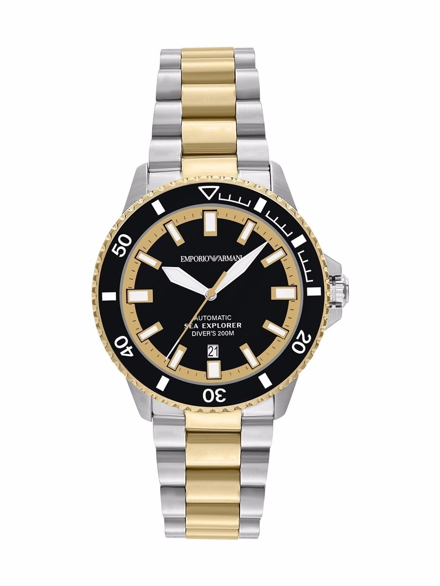 Short Description Emporio Armani's Sea Explorer is a 42.5mm automatic dive watch featuring sapphire crystal and Super-LumiNova® on hands, indexes and bezel markings for optimal visibility in dark underwater conditions. As indicated by the 'Diver's' marking on the dial, this watch is ISO 6425 certified, making it expertly equipped for deep-sea diving up to 200 meters. This iteration boasts a glossy black enamel dial and an integrated two-tone stainless steel bracelet.