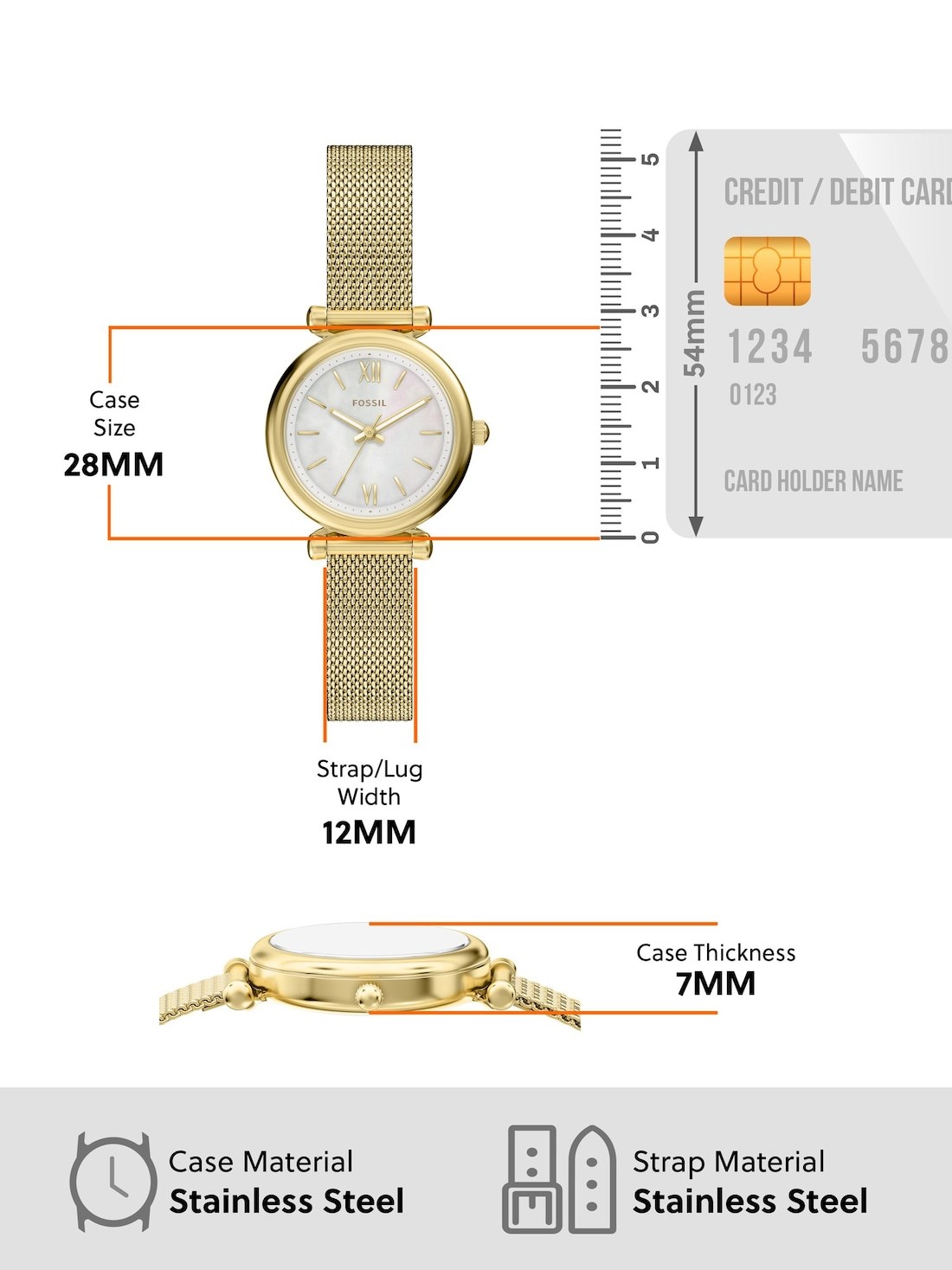 Watch Features fossil, fossil watches for women, women's fossil watches, stainless steel watches for women, gold watches for women, gold-tone watches for women, quartz three hand watches for women, carlie, engraving, japan, japanese movement, mother of pearl, women's classic watches, women's engravable watches, women's mother of pearl watches