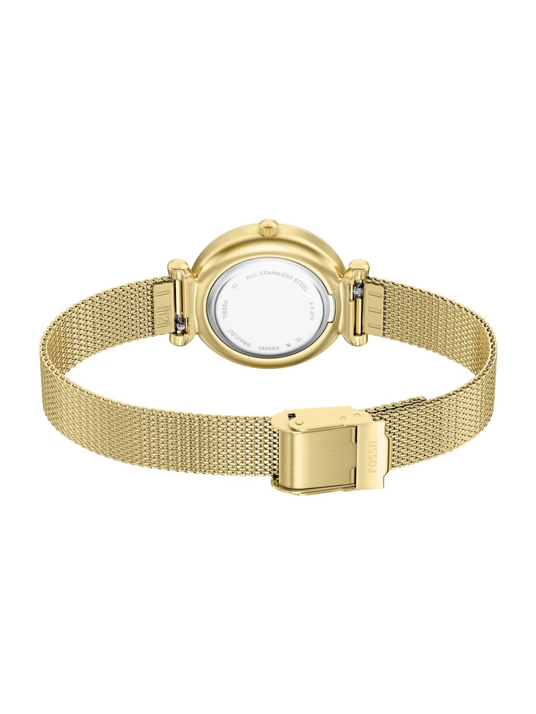 Short Description A glossy, mother-of-pearl-white sets a luminous tone against the gold-tone stainless steel case, accented with slim hands and markers for a refined finish. The gold-tone stainless steel mesh band adds a bright contrast and features an adjustable safety sliding buckle for a tailored fit.