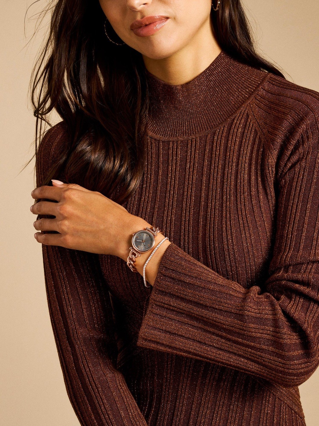 Short Description For an on-trend layered moment, look no further. This stunning set comes with our wear-everywhere Carlie watch featuring our redesigned ‘90s-inspired T-bar and rose gold-tone stainless steel bracelet, paired with a rose gold-tone crystal tennis bracelet with a lobster clasp closure.