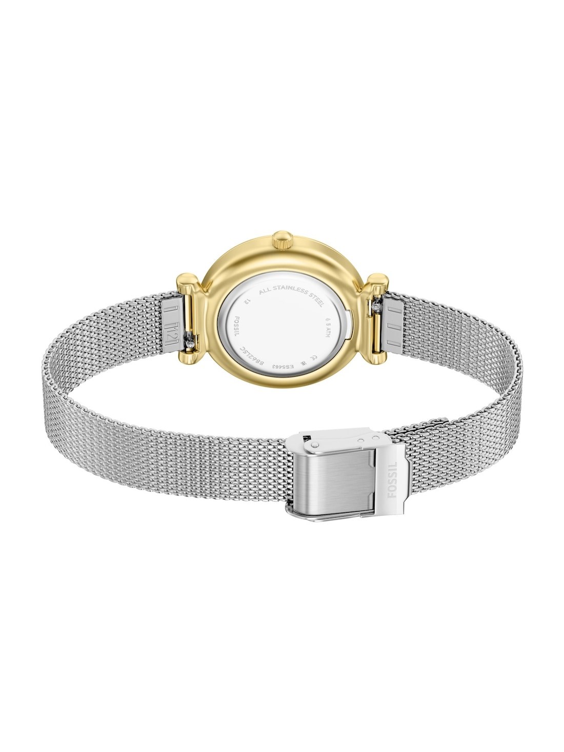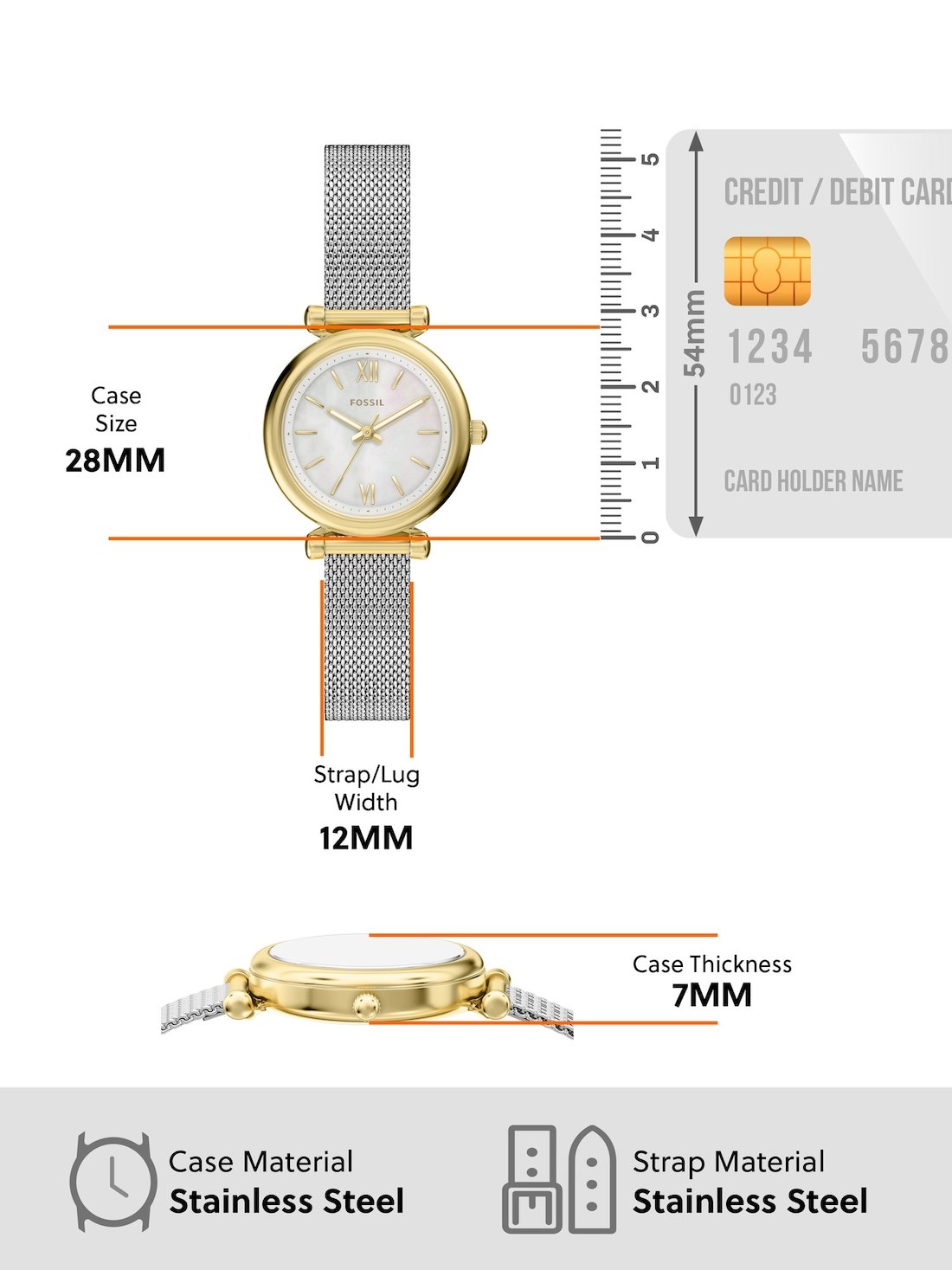 Watch Features fossil, fossil watches for women, women's fossil watches, stainless steel watches for women, silver watches for women, silver-tone watches for women, quartz three hand watches for women, carlie, engraving, japan, japanese movement, mother of pearl, women's classic watches, women's engravable watches, women's mother of pearl watches