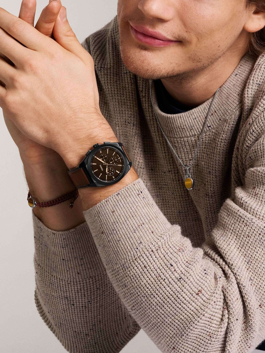 Short Description Exuding effortless style, the Everett Chronograph. This sporty watch with a rich brown leather strap, black sunray dial, encased in a 44mm round black stainless steel case, under an amber-tinted crystal lends a touch of modern inspiration. A functional Japanese chronograph quartz movement ensures this versatile timepiece keeps you on schedule. Slip on this iconic accessory and take on whatever comes your way. Fossil leather products support responsible manufacturing via the Leather Working Group.