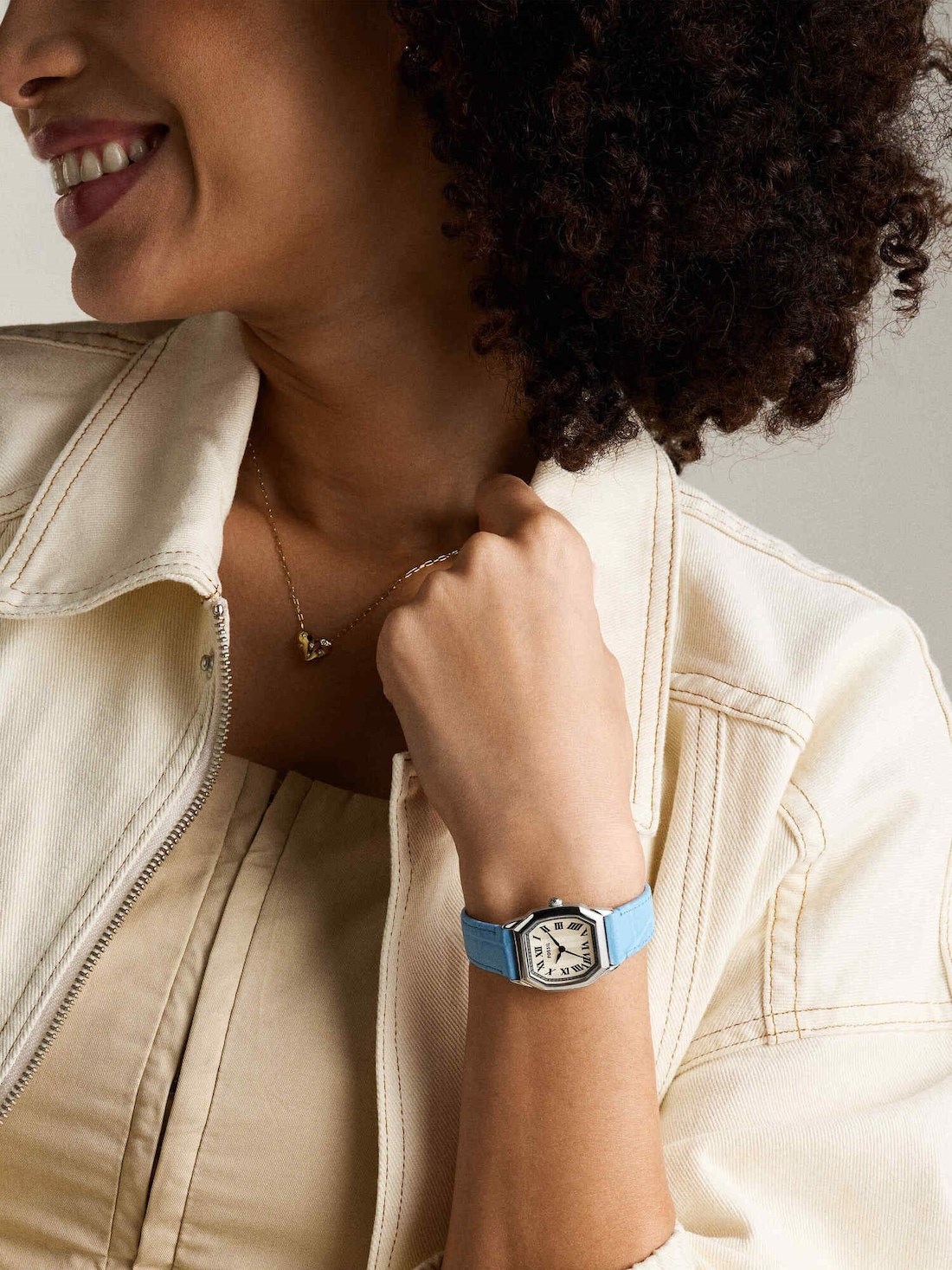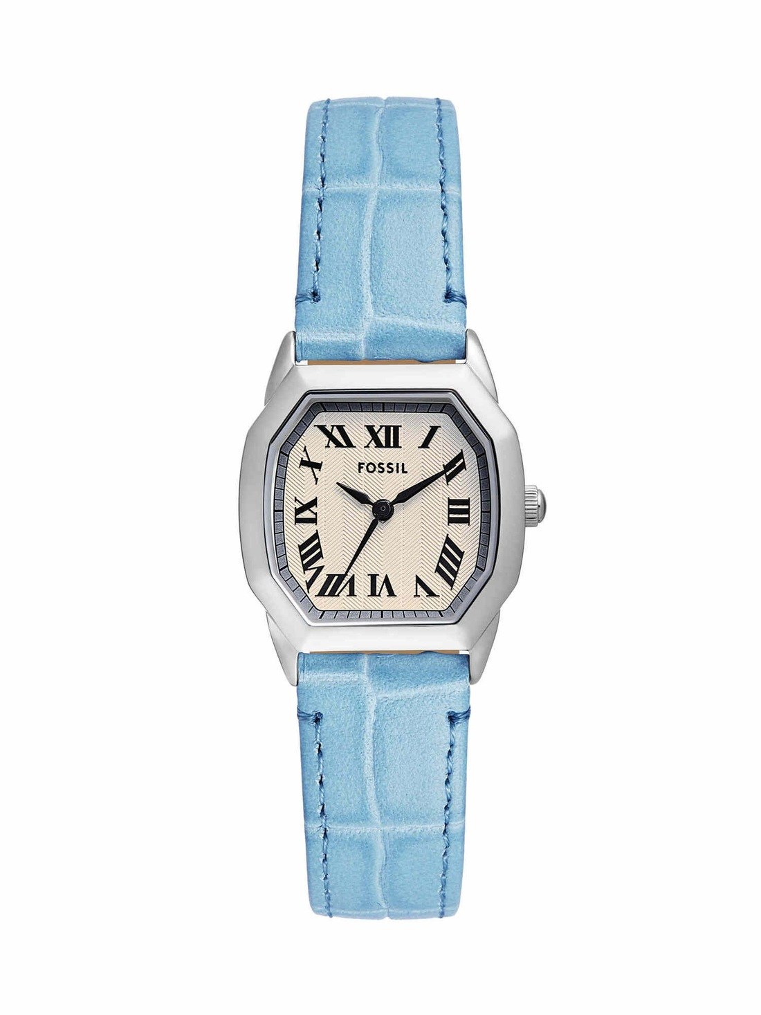 Short Description Inspired by a classic archival style, Harlow brings the sophistication of the past to the modern day. This timeless timepiece features an octagonal-shaped case with polished stainless steel, textured cream dial, three-hand movement and a light blue embossed leather strap. Fossil leather products support responsible manufacturing via the Leather Working Group.