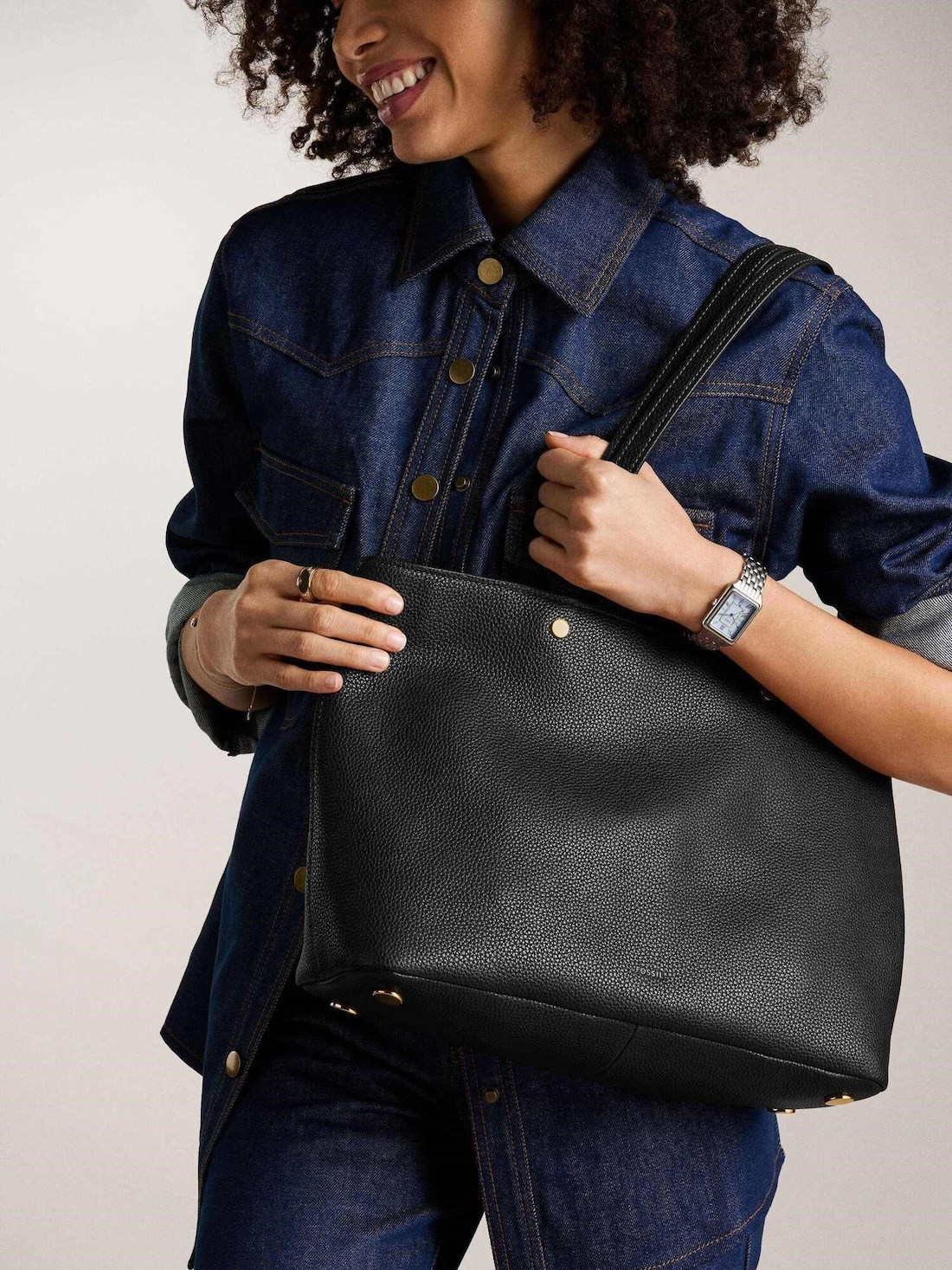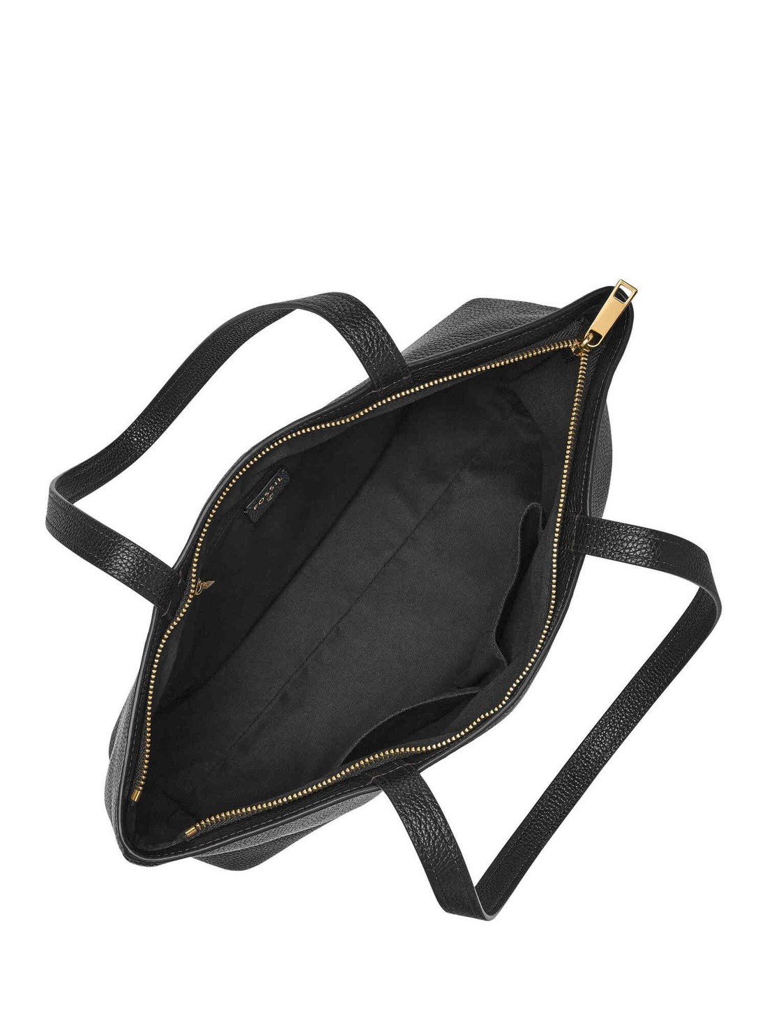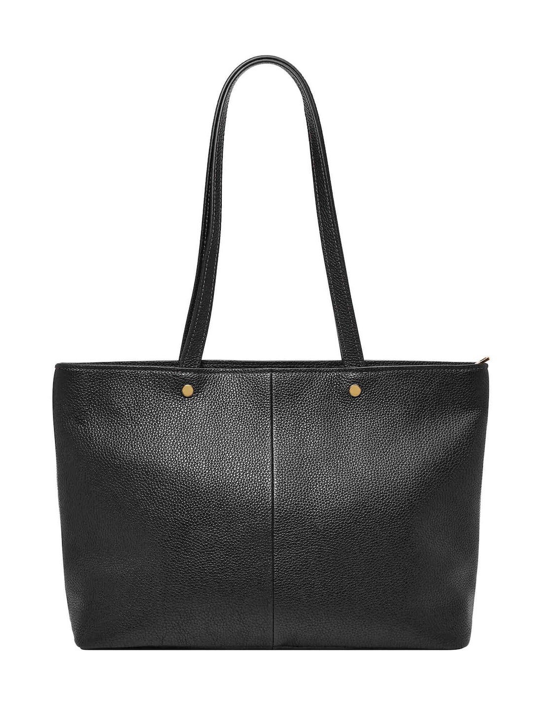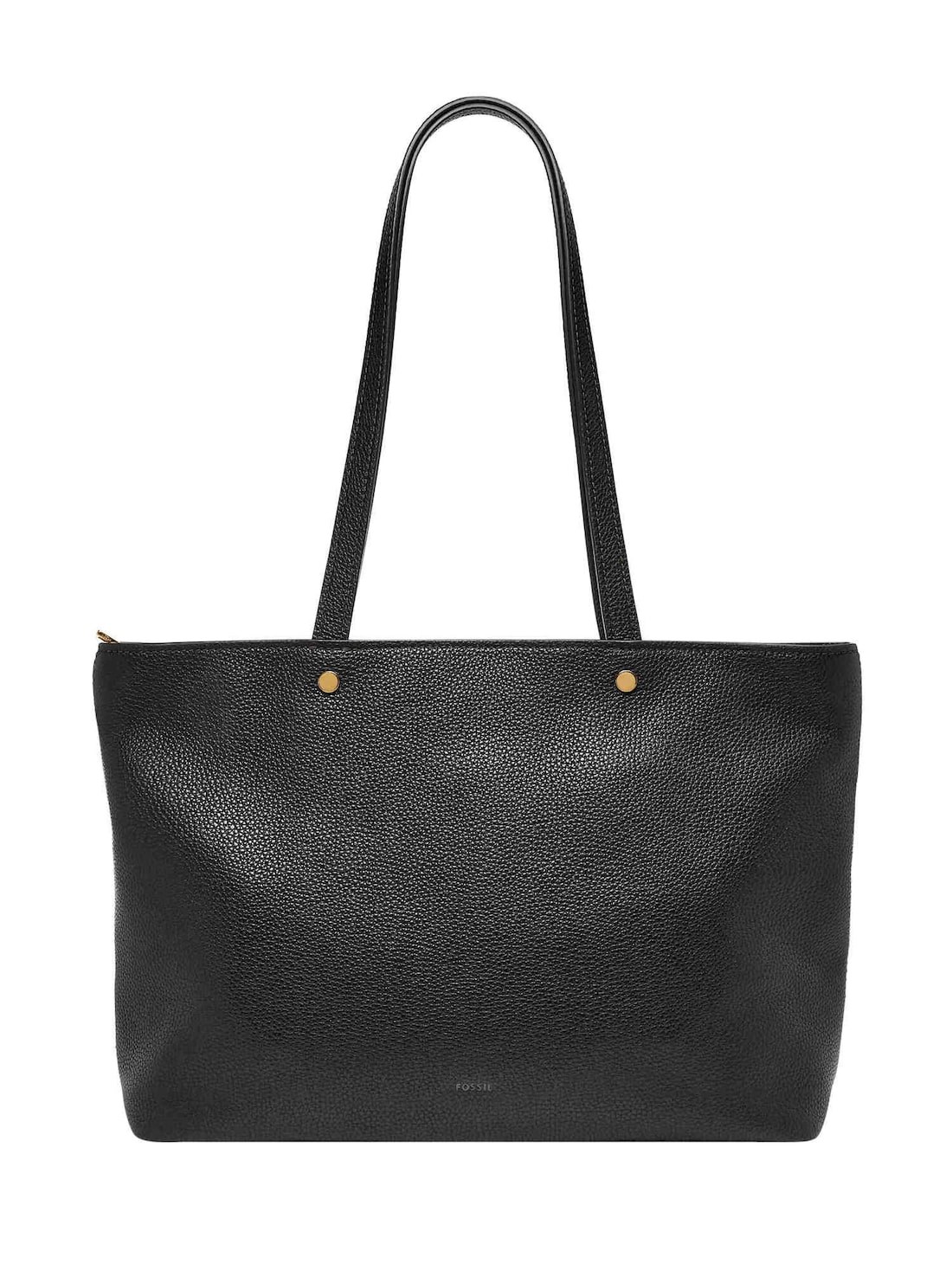 Short Description Introducing the Jessie Leather Top Zip Tote—an everyday essential with a fresh, modern look. Crafted from rich black leather with gold-tone hardware, this spacious tote offers ample interior space and secures all your essentials with a top zip closure. Slide pockets and a zippered compartment keep you organized. Refined yet relaxed, the Jessie Tote is the perfect companion for your spring adventures. Fossil leather products support responsible manufacturing via the Leather Working Group.