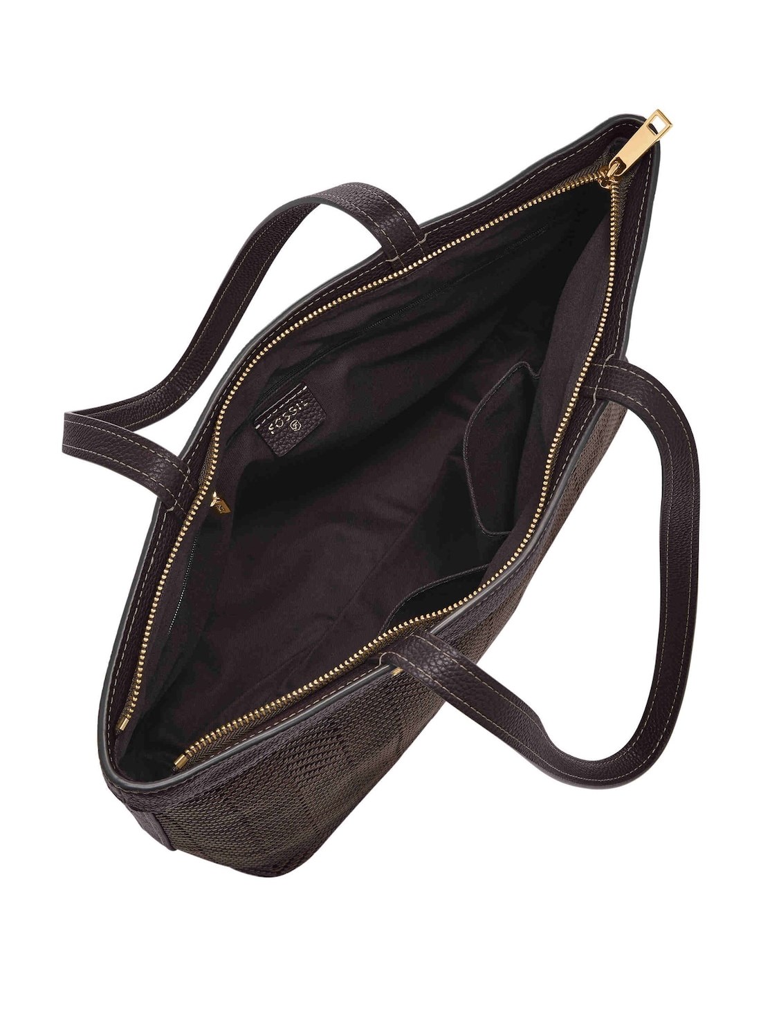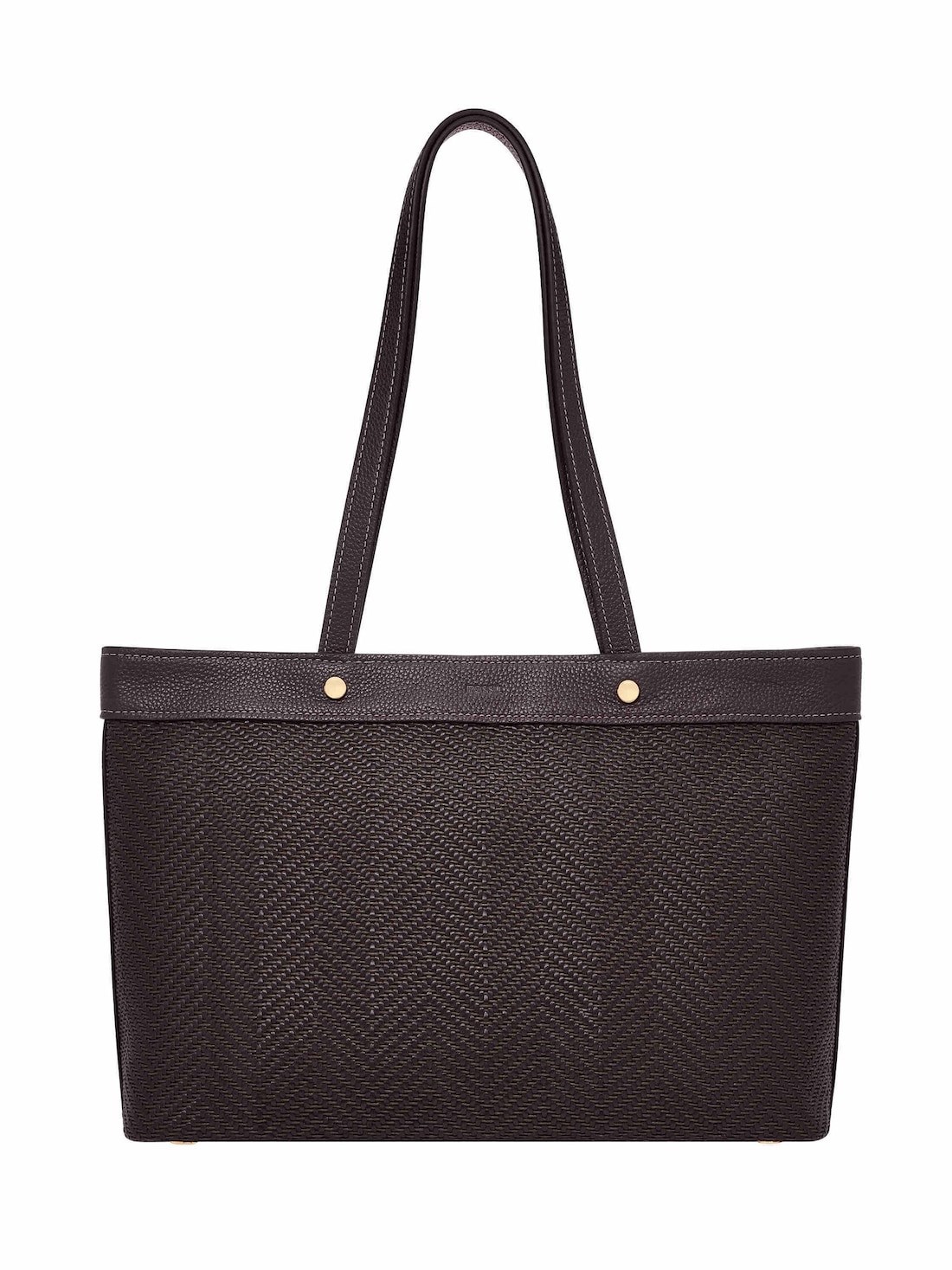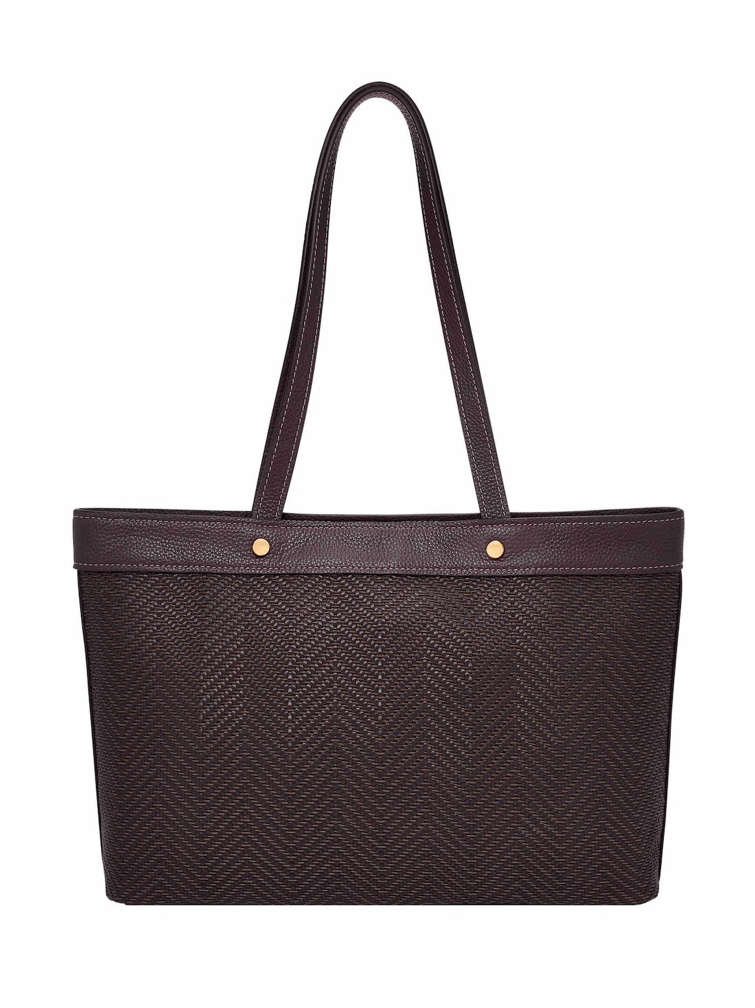 Short Description Crafted from a woven fabric and accented with textured leather trim, this tote combines versatility with a lightweight feel. The thoughtful design includes shoulder straps for comfortable carrying. Metal feet, add to the functional yet refined design. This piece is created to complement your day-to-day essentials with understated ease. Fossil leather products support responsible manufacturing via the Leather Working Group.