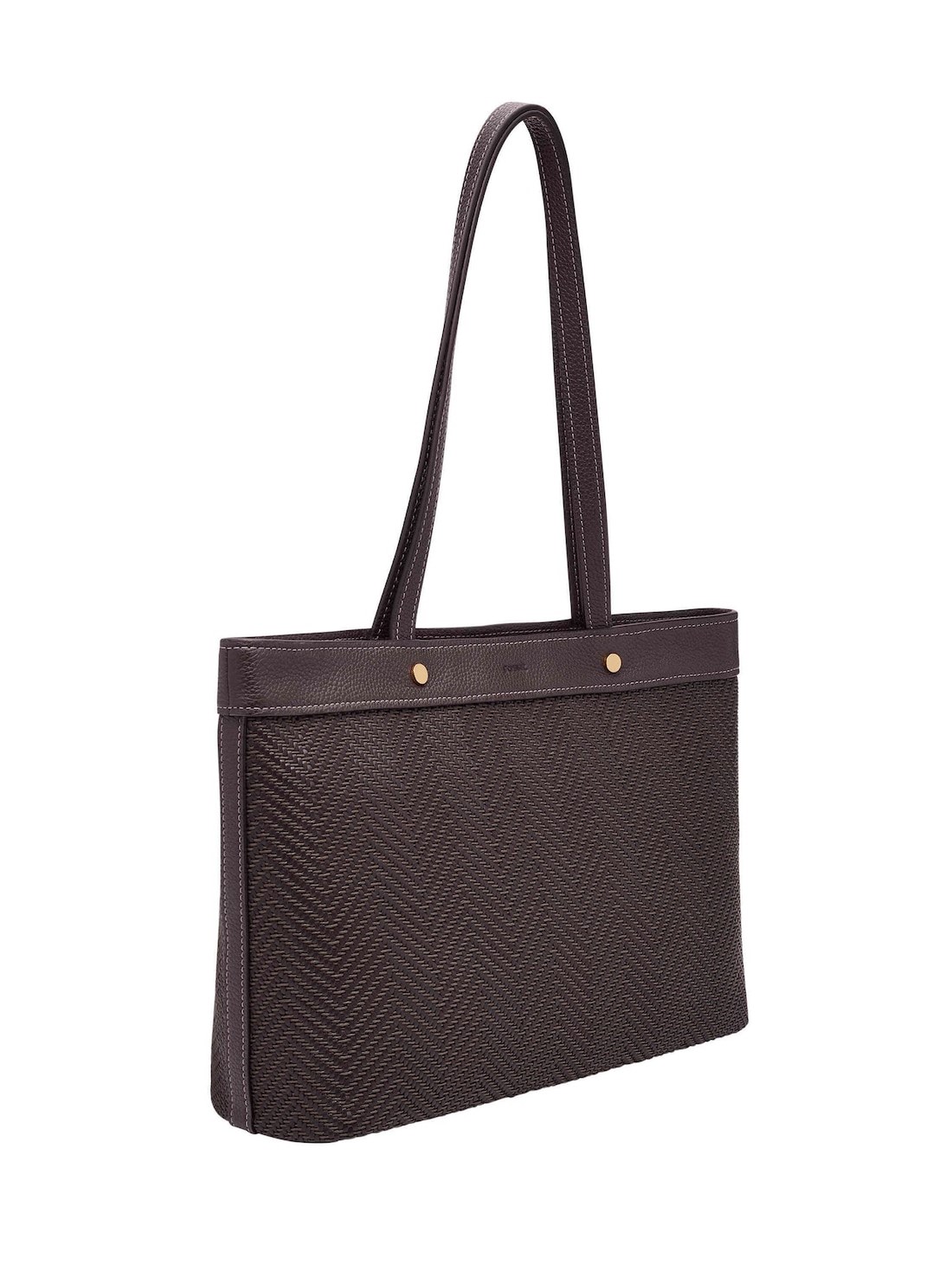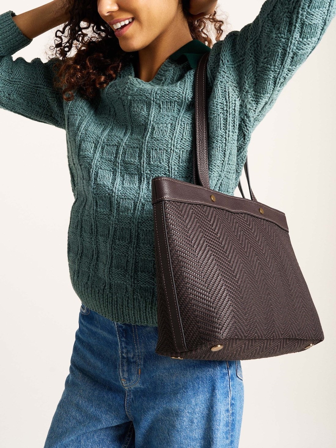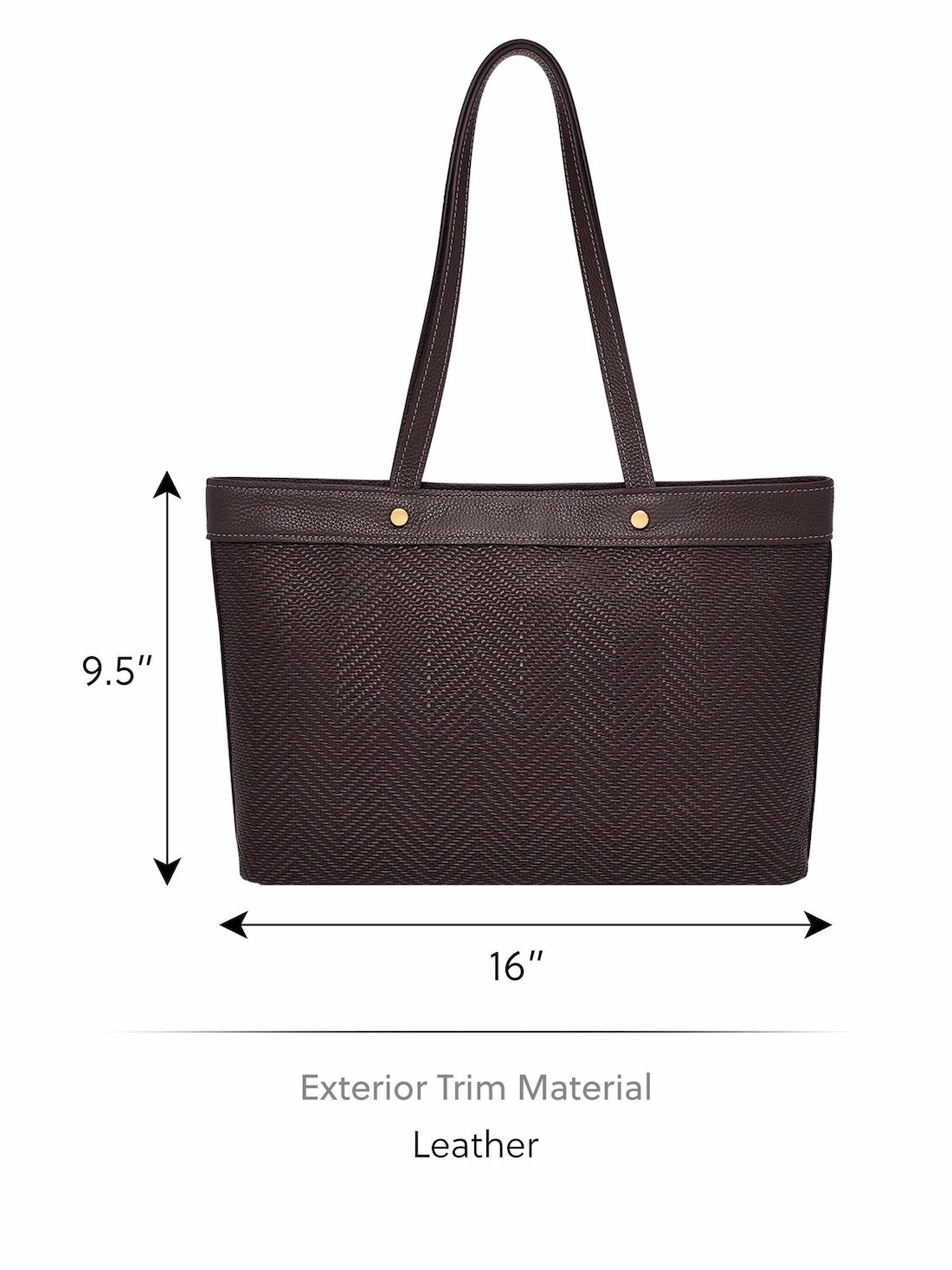 Short Description Crafted from a woven fabric and accented with textured leather trim, this tote combines versatility with a lightweight feel. The thoughtful design includes shoulder straps for comfortable carrying. Metal feet, add to the functional yet refined design. This piece is created to complement your day-to-day essentials with understated ease. Fossil leather products support responsible manufacturing via the Leather Working Group.