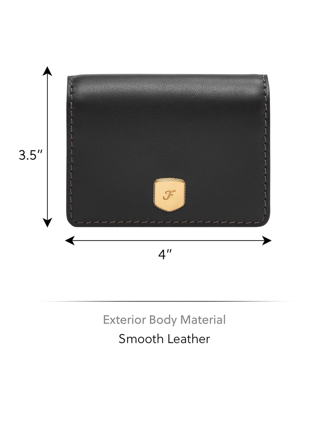 Short Description Sleek and sophisticated, the Lennox flap card case balances rich, black leather with a modern silhouette. A snap closure featuring the iconic crest with knurled edges secures essentials in the roomy interior, complete with a zipper pocket and card slots. The exterior slide pocket offers grab-and-go convenience. Gold-tone hardware lends an elegant finish to this versatile accessory. Effortlessly carry your style. Fossil leather products support responsible manufacturing via the Leather Working Group.