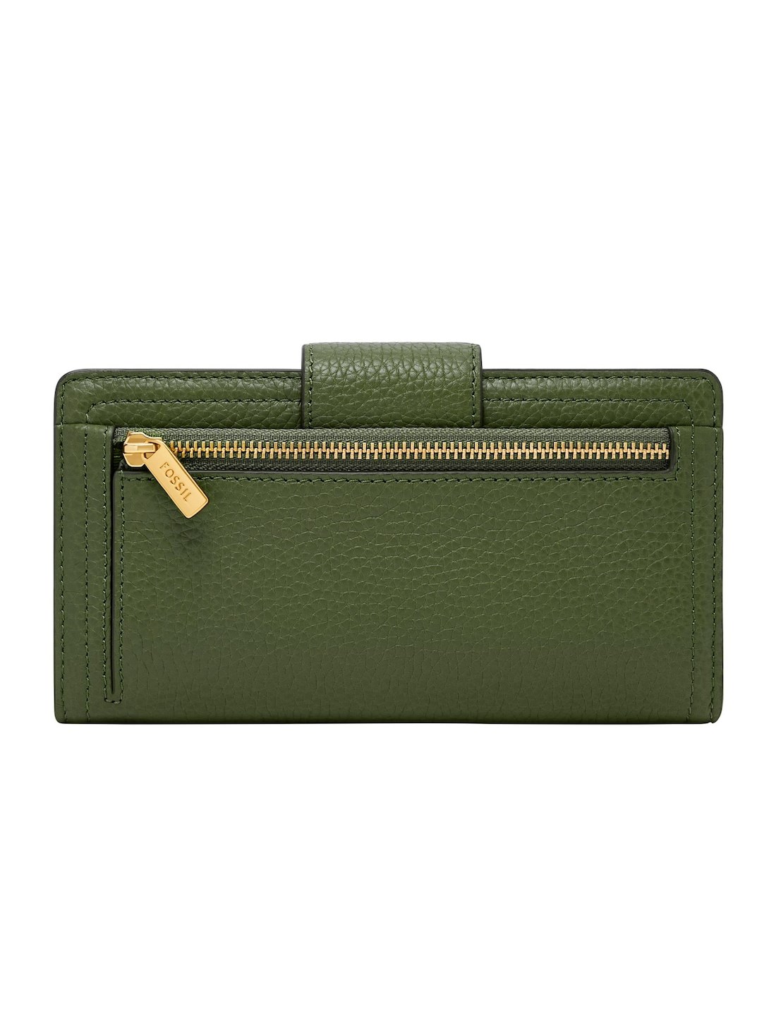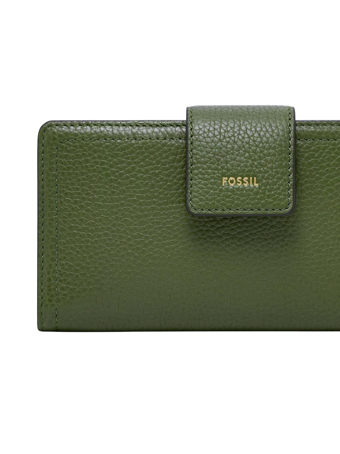 Short Description Crafted from genuine leather, this tab clutch strikes a perfect balance between practicality and style. Inside, it offers multiple credit card slots, an ID window, and compartments for bills and receipts, all secured with a snap closure. RFID-blocking technology adds an extra layer of protection, while the slim silhouette fits easily into bags or can be carried on its own. A back zip pocket provides extra space for coins or small essentials. Dressed in the color Mystic, our defining shade of the season—a leafy green with golden undertones that captures the spirit of Modern Americana.Fossil leather products support responsible manufacturing via the Leather Working Group.
