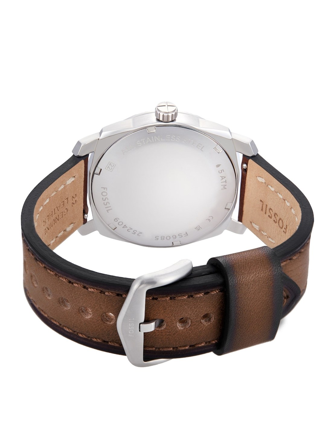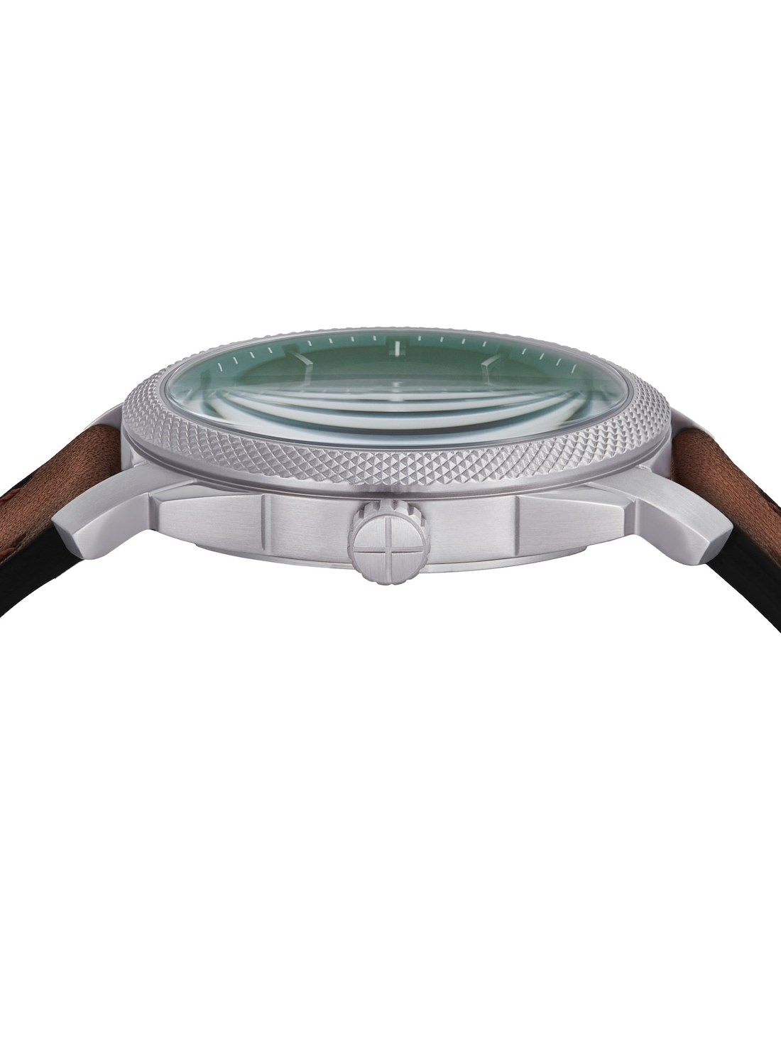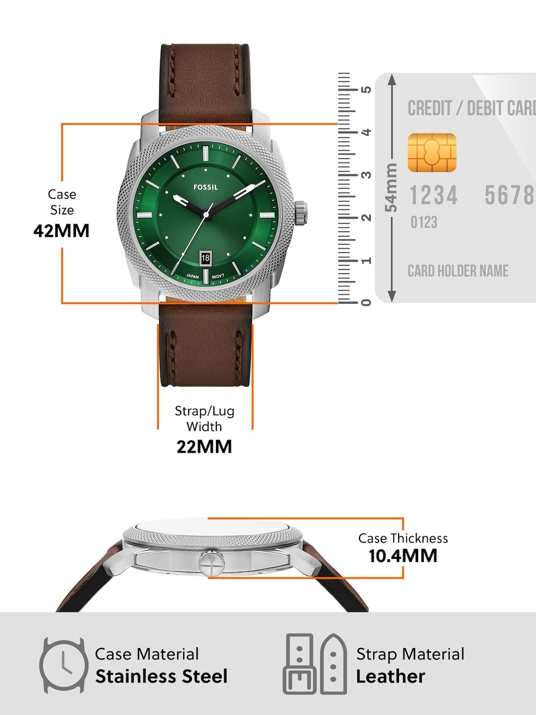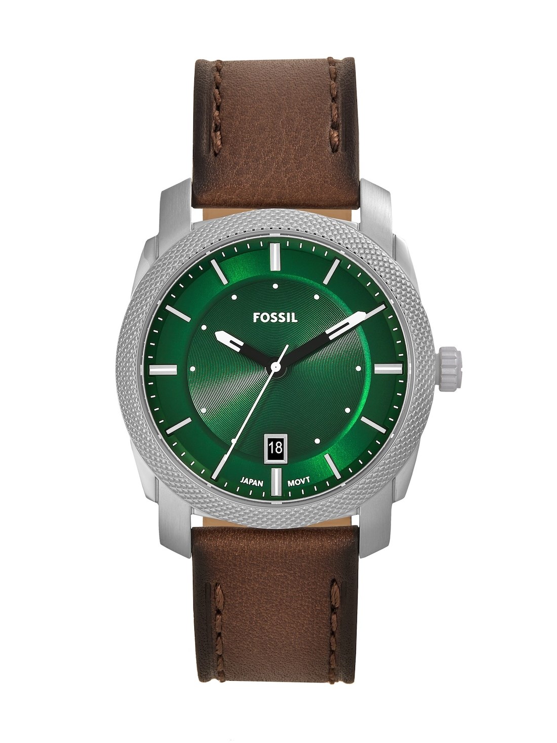 Short Description Inspired by traditional manufacturing techniques, the Machine exudes an industrial casual style. The vibrant green sunray dial contrasts against the 42mm round stainless steel case. The rugged topring knurling and a rich brown leather strap lend this iconic timepiece a bold, modern edge. Crafted for those who appreciate a versatile watch ready for any adventure. Fossil leather products support responsible manufacturing via the Leather Working Group.