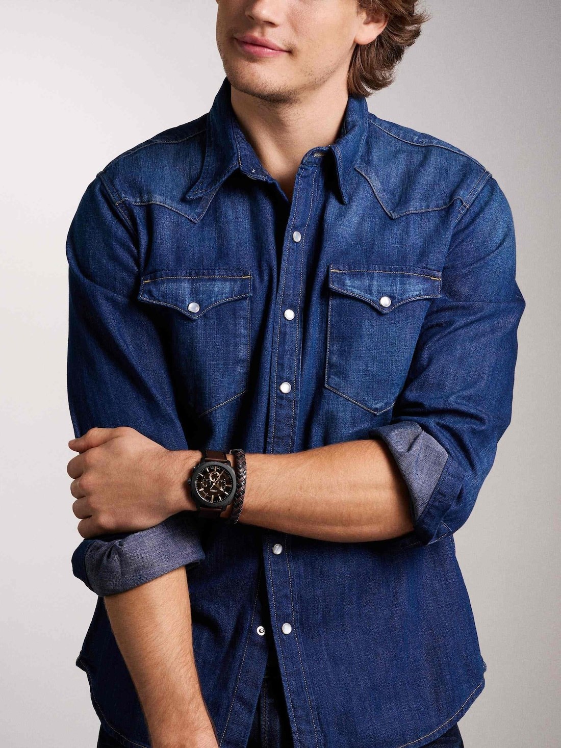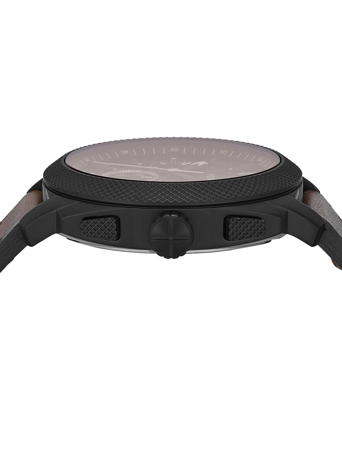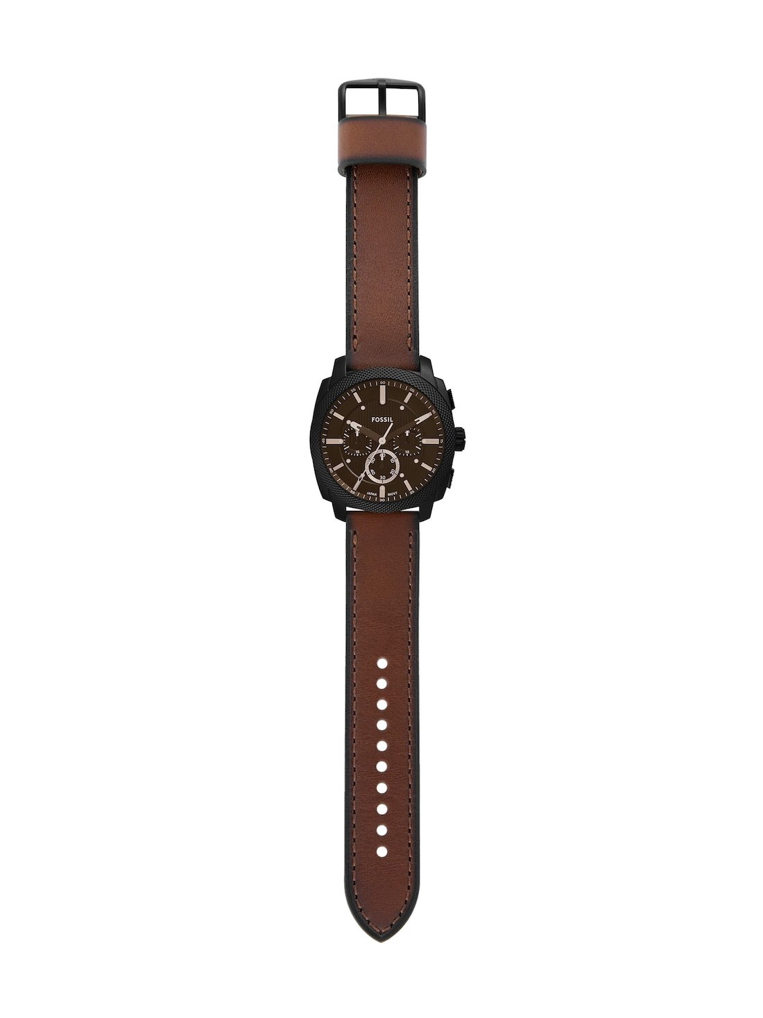 Short Description The Machine Chronograph commands attention with its bold knurled topring. Unmistakably masculine with a bold 44mm case housing a brushed black dial with textured details, all protected by an amber-tinted mineral crystal face. Powered by a precision quartz chronograph movement, this rugged timepiece is built to last with a rich brown leather strap. This watch is paired with a matching black and brown braided leather bracelet for the perfect gift. Fossil leather products support responsible manufacturing via the Leather Working Group.